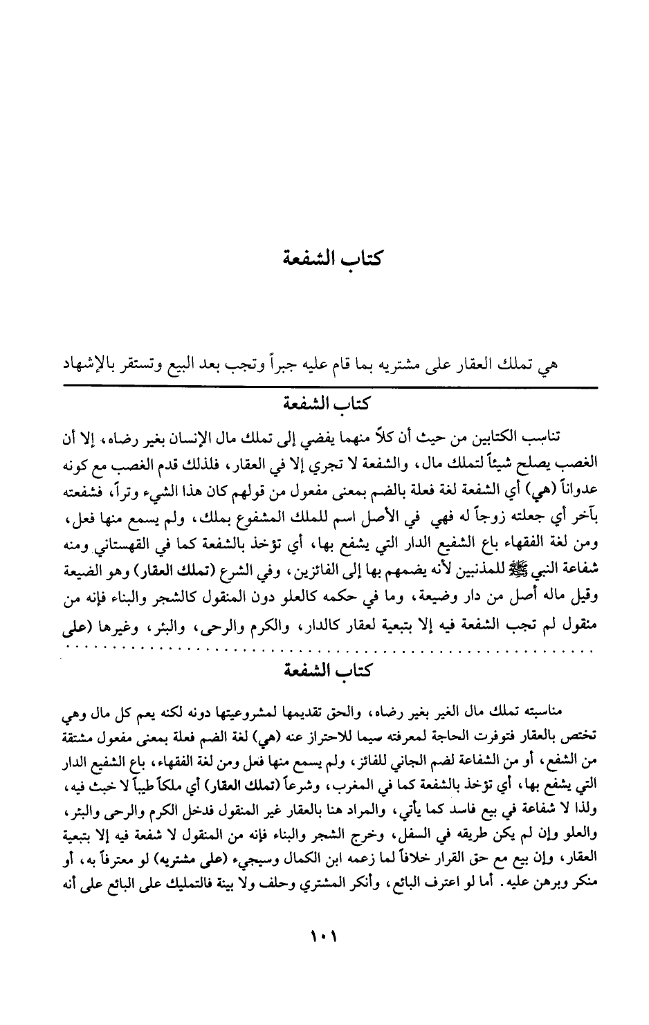 وفي الشرع تملك العقار وهو الضيعة وقيل ما له أصل من دار وضيعة وما في حكمه كالعلو دون المنقول كالشجر والبناء فإنه من منقول لم تجب الشفعة فيه إلا بتبعية لعقار كالدار والكرم والرحى والبئر وغيرها على