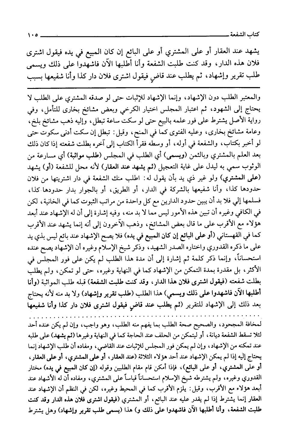 وفي رواية الأصل يشترط على فور علمه بالبيع حتى لو سكت ساعة تبطل وإليه ذهب مشايخ بلخي وعامة مشايخ بخارى وعليه الفتوى كما في المنح وقيل تبطل إن سكت أدنى سكوت حتى ولو أخبر بكتاب والشفعة في أوله أو وسطه فقرأ الكتاب إلى آخره بطلت شفعته إذا كان ذلك بعد العلم بالمشتري وبالثمن ويسمى أي الطلب في المجلس طلب مواثبة أي مسارعة من الوثوب سمي به ليدل على غاية التعجيل ثم يشهد عند العقار لأنه محل للشفعة أو يشهد على المشتري ولو غير ذي يد بأن يقول له أطلب منك الشفعة في دار اشتريتها من فلان حدودها كذا وأنا شفيعها بالشركة في الدار أو الطريق أو بالجوار بدار حدودها كذا فسلمها لي فلا بد أن يبين حدود الدارين مع كل واحدة من مراتب الثبوت كما في الخانية لكن في الكافي وغيره أن تبين هذه الأمور ليس مما لا بد منه وفيه إشارة إلى أن له الإشهاد عند أبعد هؤلاء مع الأقرب على ما قال بعض المشايخ وذهب الآخرون إلى أنه إنما يشهد عند الأقرب كما في القهستاني أو على البائع إن كان المبيع في يده فلا يصح الإشهاد عند البائع ليس بذي يد على ما ذكره القدوري واختاره الصدر الشهيد وذكر شيخ الإسلام وغيره أن الإشهاد يصح عنده استحسانا وإنما ذكر كلمة ثم إشارة إلى أن هذه مدة هذا الطلب لم يكن على فور المجلس في الأكثر بل مقدرة بمدة التمكن من الإشهاد كما في النهاية وغيره حتى لو تمكن ولم يطلب بطلت شفعته فيقول اشترى فلان هذه الدار وقد كنت طلبت الشفعة قبله طلب المواثبة وأنا أطلبها الآن فاشهدوا على ذلك ويسمى هذا الطلب طلب تقرير وإشهاد ولا بد منه لأنه يحتاج