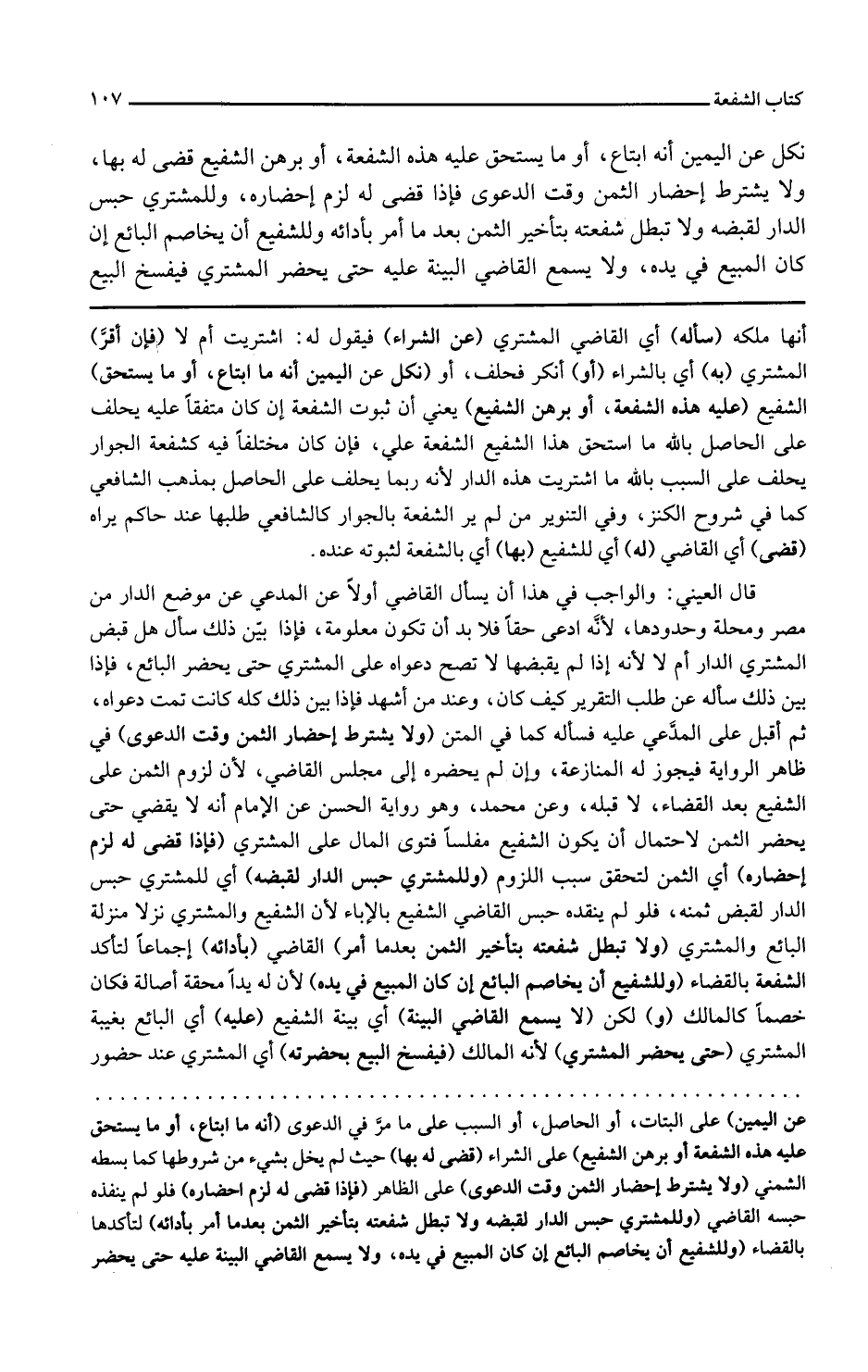 ولا يشترط إحضار الثمن وقت الدعوى في ظاهر الرواية فتجوز له المنازعة وإن لم يحضره إلى مجلس القاضي لأن لزوم الثمن على الشفيع بعد القضاء لا قبله وعن محمد وهو رواية الحسن عن الإمام أنه لا يقضي حتى يحضر الثمن لاحتمال أن يكون الشفيع مفلسا فتوى المال على المشتري فإذا قضى له لزم إحضاره أي الثمن لتحقق سبب اللزوم وللمشتري حبس الدار لقبضه أي للمشتري حبس الدار لقبض ثمنه فلو لم ينقده حبس القاضي الشفيع بالإباء لأن الشفيع والمشتري نزلا منزلة البائع والمشتري ولا تبطل شفعته بتأخير الثمن بعدما أمر القاضي بأدائه إجماعا لتأكد الشفعة بالقضاء