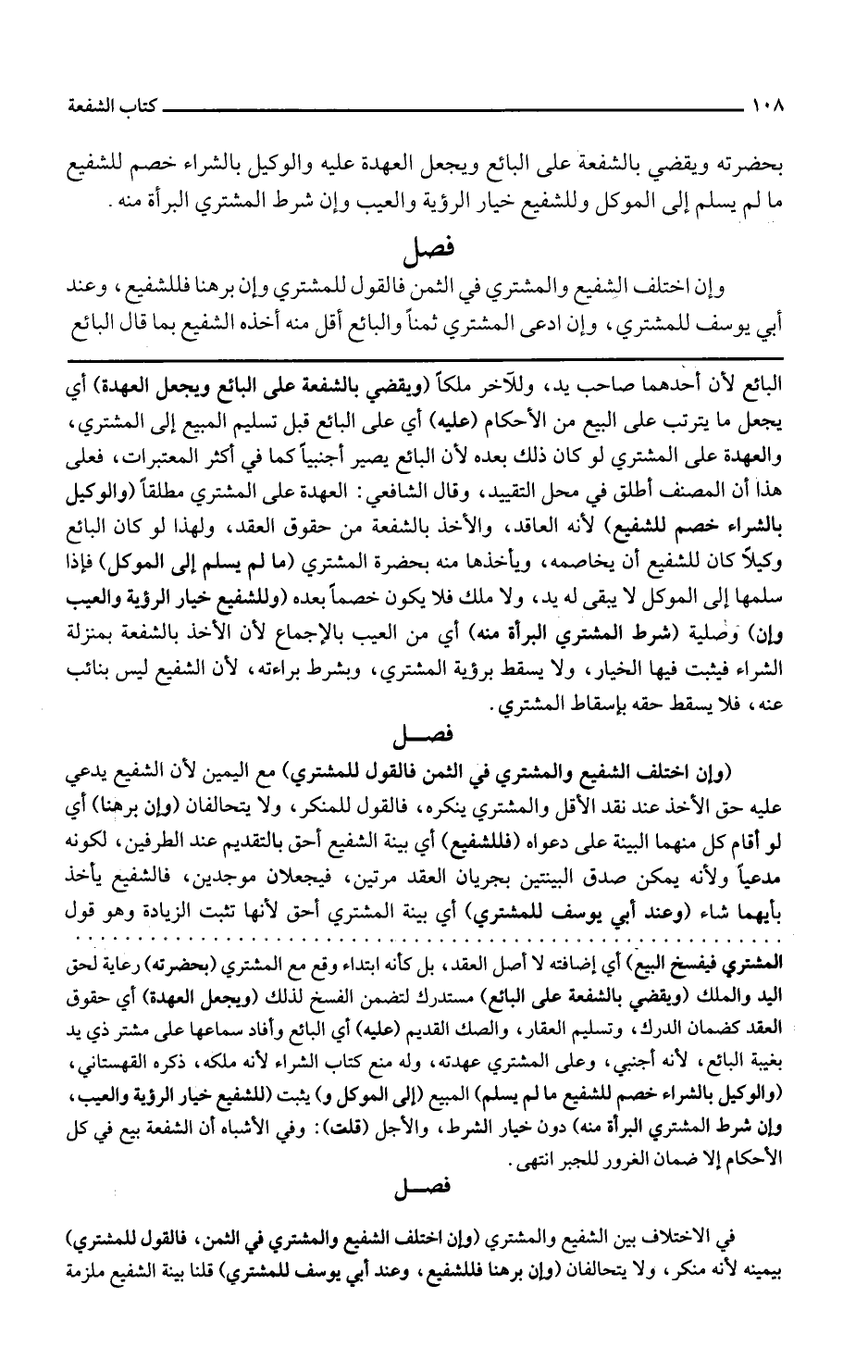 وللشفيع خيار الرؤية والعيب وإن وصلية شرط المشتري البراءة منه أي من العيب بالإجماع لأن الأخذ بالشفعة بمنزلة الشراء فيثبت فيها الخيار ولا يسقط برؤية المشتري وبشرط براءته لأن الشفيع ليس بنائب عنه فلا يسقط حقه بإسقاط المشتري