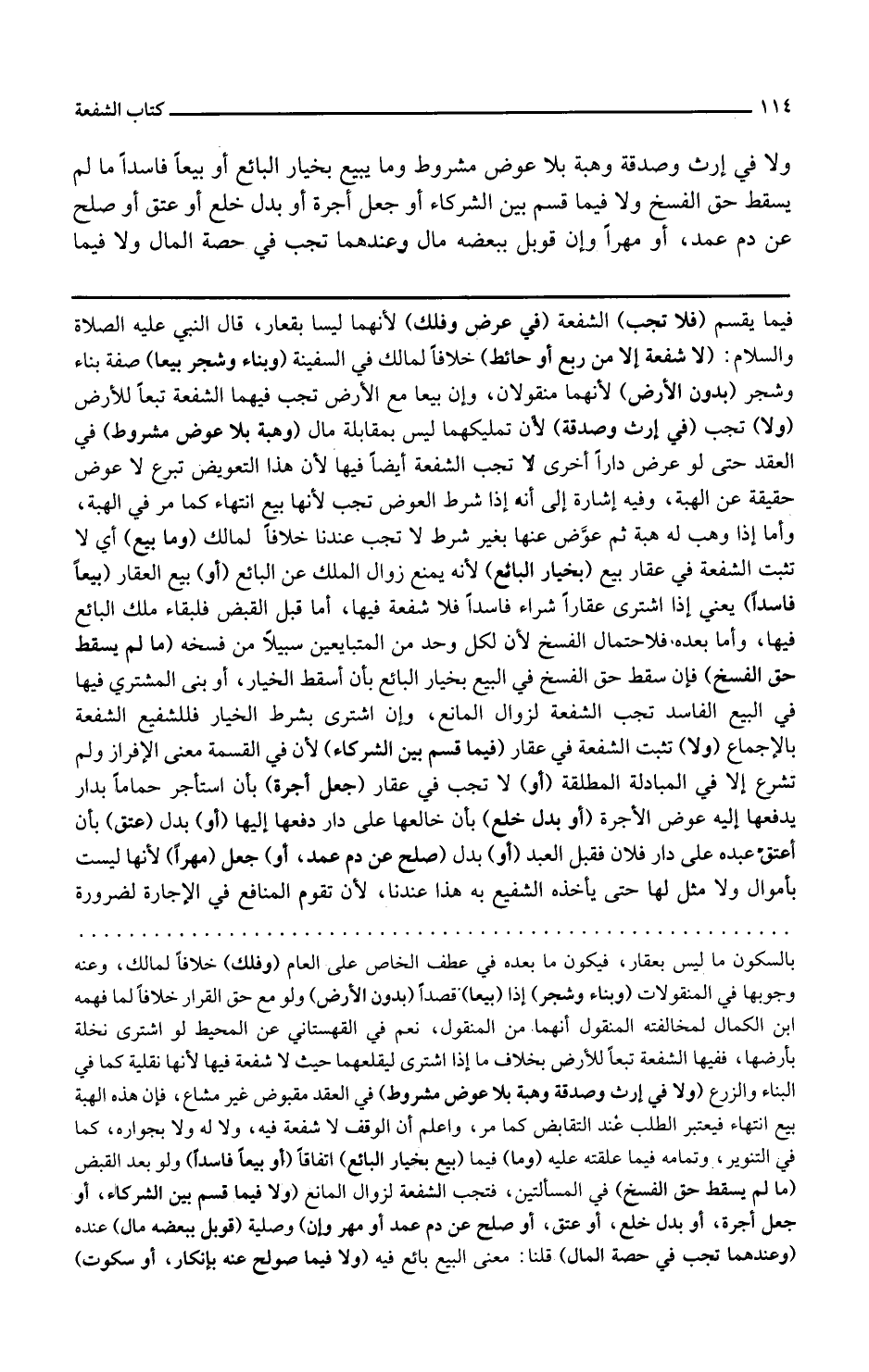 فلا تجب الشفعة في عرض وفلك لأنهما ليسا بعقار قال النبي عليه الصلاة والسلام لا شفعة إلا في ربع أو حائط خلافا لمالك في السفينة وبناء وشجر بيعا صفة بناء أو شجر بدون الأرض لأنهما منقولان وإن بيعا مع الأرض تجب فيهما الشفعة تبعا للأرض ولا تجب في إرث وصدقة لأن تمليكهما ليس بمقابلة مال وهبة بلا عوض مشروط في العقد حتى لو عوض دارا أخرى لا تجب الشفعة أيضا فيها لأن هذا التعويض تبرع لا عوض حقيقة عن الهبة وفيه إشارة إلى أنه إذا شرط العوض تجب لأنها بيع انتهاء كما مر في الهبة وأما إذا وهب له هبة ثم عوض عنها بغير شرط لا تجب عندنا خلافا لمالك