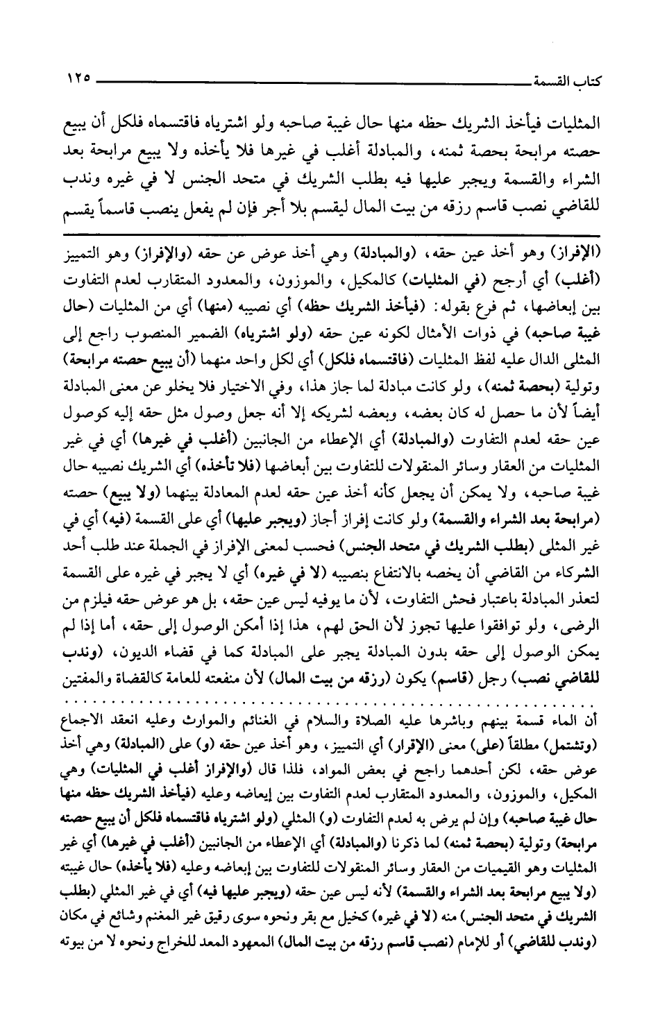 والمبادلة أي الإعطاء من الجانبين أغلب في غيرها أي في غير المثليات من العقار وسائر المنقولات للتفاوت بين أبعاضها فلا يأخذه أي الشريك نصيبه حال غيبة صاحبه ولا يمكن أن يجعل كأنه أخذ عين حقه لعدم المعاملة بينهما ولا يبيع حصته مرابحة بعد الشراء أو القسمة ولو كانت إفرازا جاز ويجبر عليها أي على القسمة فيه أي في غير المثلي بطلب الشريك في متحد الجنس فحسب لمعنى الإفراز في الجملة عند طلب أحد الشركاء من القاضي أن يخصه بالانتفاع بنصيبه لا في غيره أي لا يجبر في غيره على القسمة لتعذر المبادلة باعتبار فحش التفاوت لأن ما يوفيه ليس عين حقه بل هو عوض حقه فيلزم من الرضا ولو توقفوا عليها تجوز لأن الحق لهم هذا إذا أمكن الوصول إلى حقه أما إذا لم يمكن الوصول إلى حقه بدون المبادلة يجبر على المبادلة كما في قضاء الديون