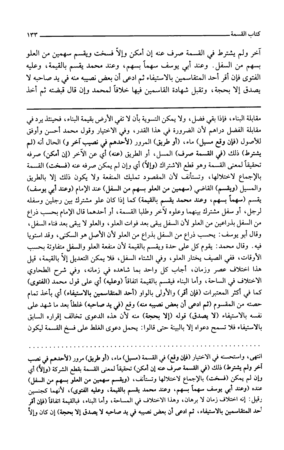 فإن وقع مسيل ماء أو طريق المرور لأحدهم في نصيب آخر و الحال أنه لم يشترط ذلك في القسمة صرف المسيل أو الطريق عنه أي عن الآخر إن أمكن صرفه تحقيقا لمعنى القسمة وهو قطع الاشتراك وإلا أي وإن لم يمكن صرفه عنه فسخت القسمة بالإجماع لاختلالها وتستأنف لأن المقصود تمليك المنفعة ولا يكون ذلك إلا بالطريق والمسيل