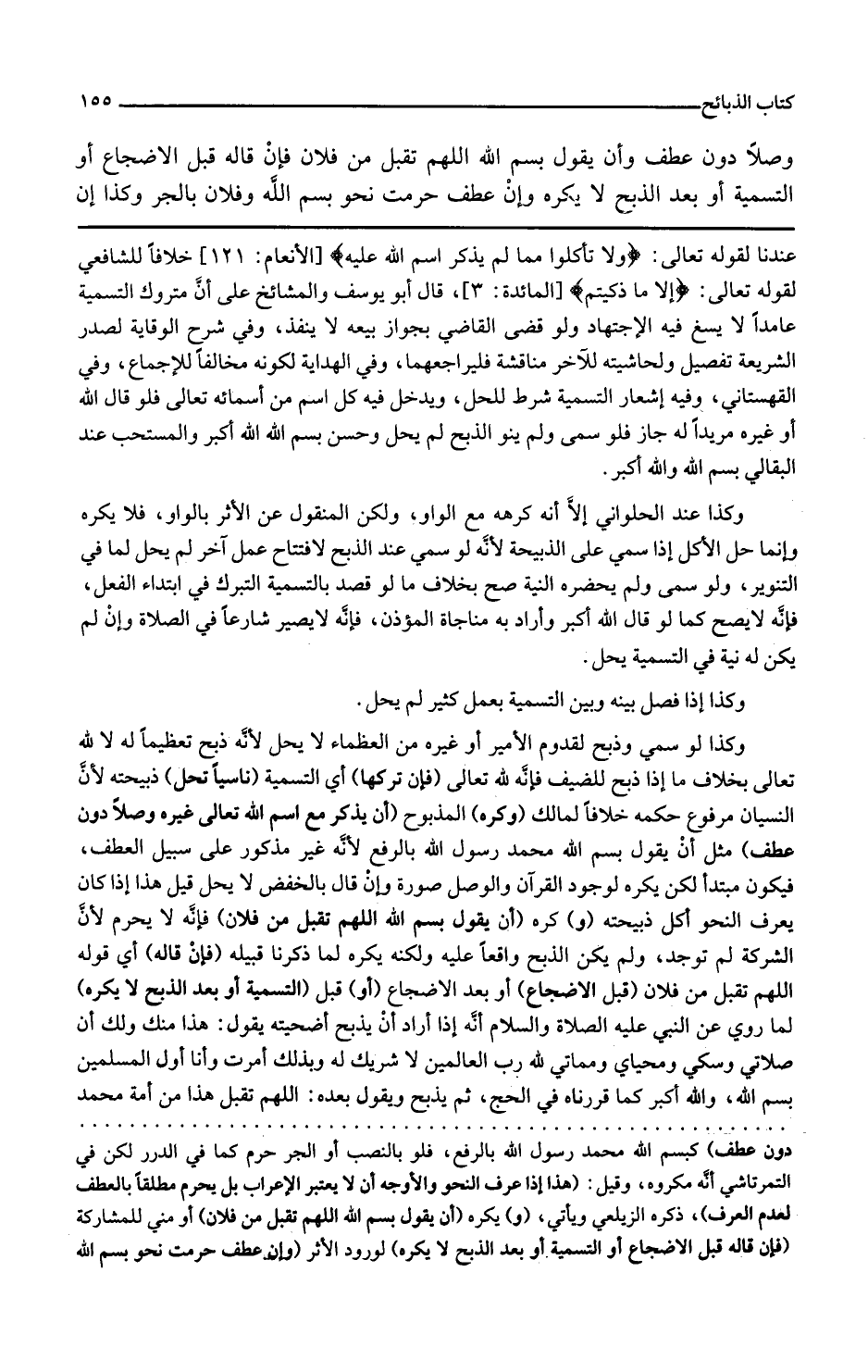 وفي شرح الوقاية لصدر الشريعة تفصيل ولحاشيته للآخر مناقشة فليرجعهما وفي الهداية لكونه مخالفا للإجماع وفي القهستاني وفيه إشعار التسمية شرط للحل ويدخل فيه كل اسم من أسمائه تعالى فلو قال الله أو غيره مريدا له جاز فلو سمى ولم ينو الذبح لم يحل وحسن باسم الله الله أكبر والمستحب عند البقالي باسم الله والله أكبر وكذا عند الحلواني إلا إنه كرهه مع الواو ولكن المنقول عن الأثر بالواو فلا يكره وإنما حل الأكل إذا سمى على الذبيحة لأنه لو سمى عند الذبح لافتتاح عمل آخر لم يحل لما في التنوير ولو سمى ولم يحضره النية صح بخلاف ما لو قصد بالتسمية التبرك في ابتداء الفعل فإنه لا يصح كما لو قال الله أكبر وأراد به مناجاة المؤذن فإنه لا يصير شارعا في الصلاة وإن لم يكن له نية في التسمية يحل وكذا إذا فصل بينه وبين التسمية بعمل كثير لم يحل وكذا لو سمى وذبح لقدوم الأمير أو غيره من العظماء لا يحل لأنه ذبح تعظيما له لا لله تعالى بخلاف ما إذا ذبح للضيف فإنه لله تعالى فإن تركها أي التسمية ناسيا تحل ذبيحته لأن النسيان مرفوع حكمه خلافا لمالك