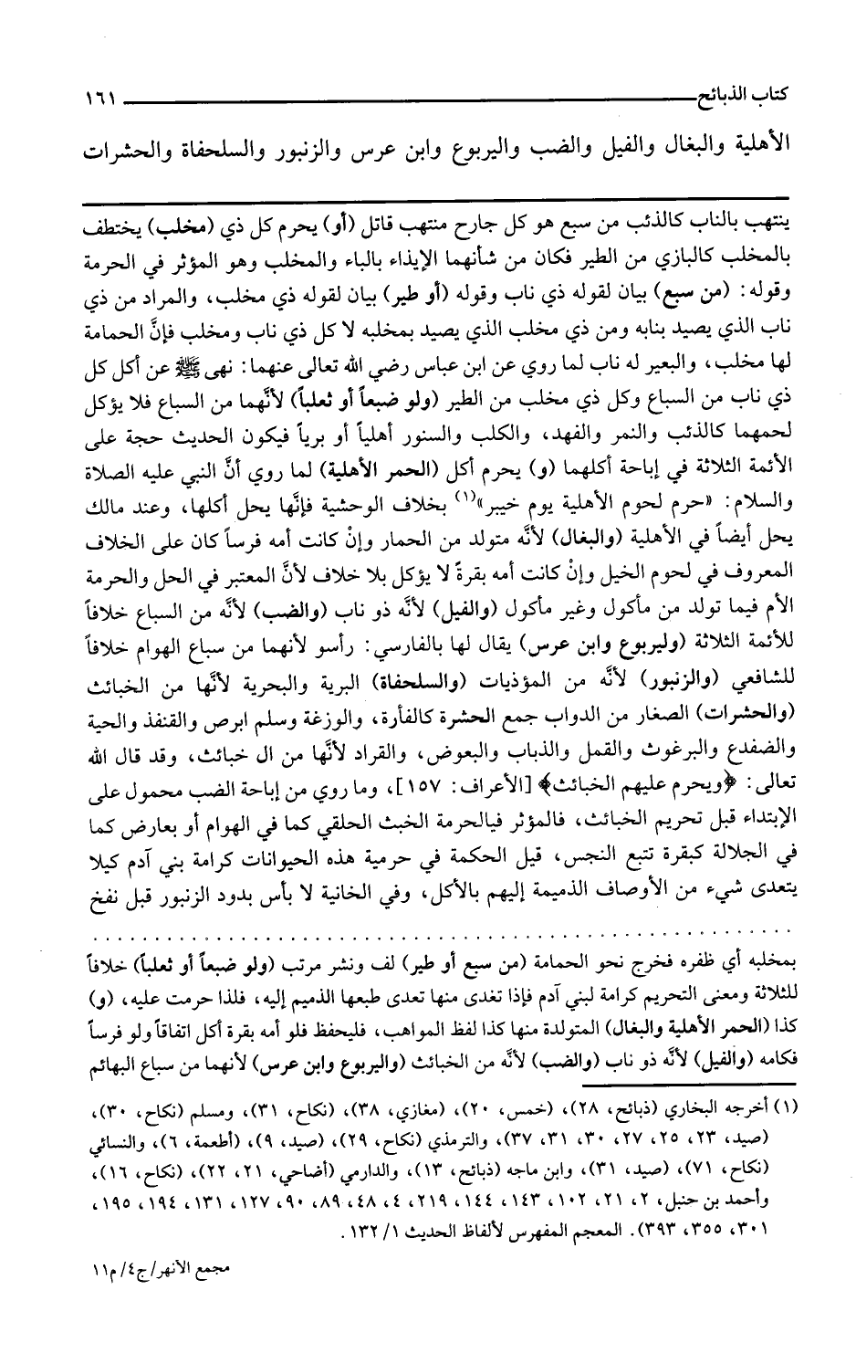 و يحرم أكل الحمر الأهلية لما روي أن النبي عليه الصلاة والسلام حرم لحوم الأهلية يوم خيبر بخلاف الوحشية فإنها يحل أكلها وعند مالك يحل أيضا في الأهلية والبغال لأنه متولد من الحمار وإن كانت أمه فرسا كان على الخلاف المعروف في لحوم الخيل وإن كانت أمه بقرة لا يؤكل بلا خلاف لأن المعتبر في الحل والحرمة الأم فيما تولد من مأكول وغير مأكول والفيل لأنه ذو ناب والضب لأنه من السباع خلافا للأئمة الثلاثة واليربوع وابن عرس يقال لها بالفارسي راسو لأنهما من سباع الهوام خلافا للشافعي والزنبور لأنه من المؤذيات والسلحفاة البرية والبحرية لأنها من الخبائث والحشرات الصغار من الدواب جمع الحشرة كالفأرة والوزغة وسام أبرص والقنفذ والحية والضفدع والبرغوث والقمل والذباب والبعوض والقراد لأنها من الخبائث وقد قال الله تعالى ويحرم عليهم الخبائث وما روي من إباحة الضب محمول على الابتداء قبل تحريم الخبائث فالمؤثر في الحرمة الخبث الخلقي كما في الهوام أو بعارض كما في الجلالة كبقرة تتبع النجس قيل الحكمة في حرمية هذه الحيوانات كرامة بني آدم كي لا يتعدى شيء من الأوصاف الذميمة إليهم بالأكل