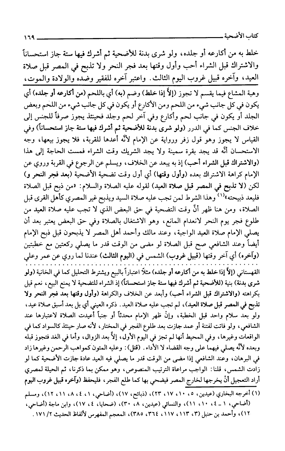 وأول وقتها أي أول وقت تضحية الأضحية بعد فجر النحر و لكن لا تذبح في المصر قبل صلاة العيد لقوله عليهم الصلاة والسلام من ذبح قبل الصلاة فليعد ذبيحته وهذا الشرط لمن تجب عليه صلاة العيد ويذبح غير المصري كأهل القرى قبل الصلاة ومن هنا ظهر أن وقت التضحية في حق البعض الذي لا تجب عليه صلاة العيد من طلوع فجر يوم النحر لانعدام المانع وهو الاشتغال بالصلاة وفي حق البعض يعتبر بعد أن يصلي الإمام صلاة العيد الواجبة وعند مالك وأحمد أهل المصر لا يذبحون قبل ذبح الإمام أيضا وعند الشافعي صح قبل الصلاة لو مضى من الوقت قدر ما يصلي ركعتين مع خطبتين وآخره أي آخر وقتها قبيل غروب الشمس في اليوم الثالث عندنا لما روي عن عمر وعلي