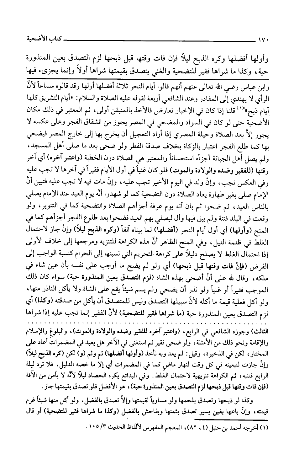 وابن عباس رضي الله تعالى عنهم أنهم قالوا أيام النحر ثلاثة أفضلها أولها وقد قالوه سماعا لأن الرأي لا يهتدي إلى المقادر وعند الشافعي أربعة لقوله عليه الصلاة والسلام أيام التشريق كلها أيام ذبح قلنا إذا كان في الأخبار تعارض فالأخذ بالمتيقن أولى ثم المعتبر في ذلك مكان الأضحية حتى لو كان في السواد والمضحي في المصر يجوز من انشقاق الفجر وعلى عكسه لا يجوز إلا بعد الصلاة وحيلة المصري إذا أراد التعجيل أن يخرج بها إلى خارج المصر فيضحي بها كما طلع الفجر اعتبار بالزكاة بخلاف صدقة الفطر ولو ضحى بعدما صلى أهل المسجد ولم يصل أهل الجبانة أجزأه استحسانا والمعتبر هي الصلاة دون الخطبة واعتبر آخره أي آخر وقتها للفقير وضده والولادة والموت فلو كان غنيا في أول الأيام فقيرا في آخرها لا تجب عليه وفي العكس تجب وإن ولد في اليوم الأخير تجب عليه وإن مات فيه لا تجب عليه فتبين أن الإمام صلى بغير طهارة يعاد الصلاة دون التضحية كما لو شهدوا أنه يوم العيد عند الإمام يصلي بالناس العيد ثم ضحوا ثم بان أنه يوم عرفة أجزأهم الصلاة والتضحية كما في التنوير ولو وقعت في البلد فتنة ولم يبق فيها وال ليصلي بهم العيد فضحوا بعد طلوع الفجر أجزأهم كما في المنح وأولها أي أول أيام النحر أفضلها لما بيناه آنفا