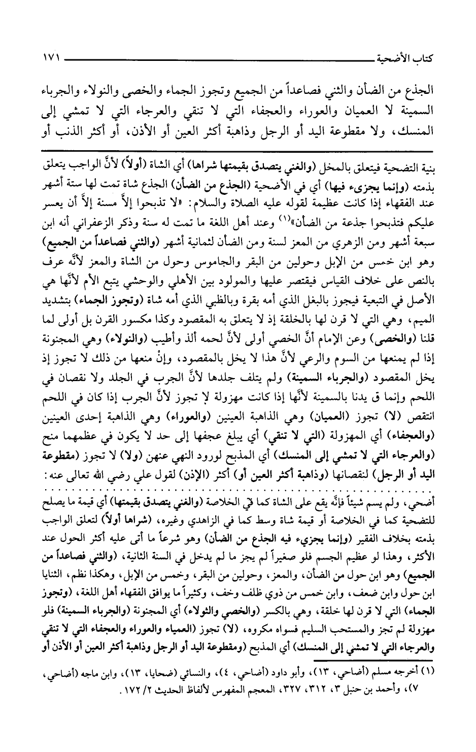 وإنما يجزئ فيها أي في الأضحية الجذع من الضأن الجذع شاة تمت لها ستة أشهر عند الفقهاء إذا كانت عظيمة لقوله عليه الصلاة والسلام لا تذبحوا إلا مسنة إلا أن يعسر عليكم فتذبحوا جذعة من الضأن وعند أهل اللغة ما تمت له سنة وذكر الزعفراني أنه ابن سبعة أشهر وعن الزهري من المعز لسنة ومن الضأن لثمانية أشهر والثني فصاعدا من الجميع وهو ابن خمس من الإبل وحولين من البقر والجاموس وحول من الشاة والمعز لأنه عرف بالنص على خلاف القياس فيقتصر عليها والمولود بين الأهلي والوحشي يتبع الأم لأنها هي الأصل في التبعية فيجوز بالبغل الذي أمه بقرة وبالظبي الذي أمه شاة وتجوز الجماء بتشديد الميم وهي التي لا قرن لها بالخلقة إذ لا يتعلق به المقصود وكذا مكسور القرن بل أولى لما قلنا والخصي