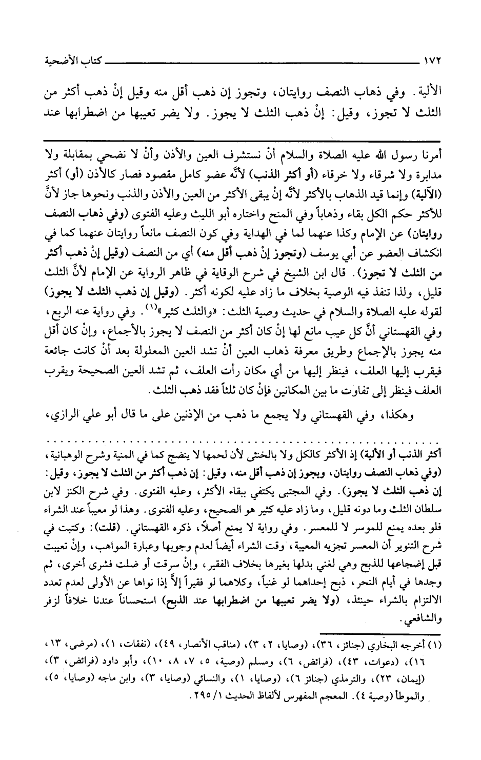 أمرنا رسول الله عليه الصلاة والسلام أن نستشرف العين والأذن وأن لا نضحي بمقابلة ولا مدابرة ولا شرقاء ولا خرقاء أو أكثر الذنب لأنه عضو كامل مقصود فصار كالأذن أو أكثر الألية وإنما قيد الذهاب بالأكثر لأنه أن يبقى الأكثر من العين والأذن والذنب ونحوها جاز لأن للأكثر حكم الكل بقاء وذهابا