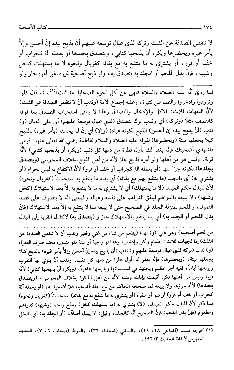 ويتصدق بجلدها لكونه جزءا منها أو يعمله آلة كجراب أو خف أو فرو لأن الانتفاع به ليس بحرام أو يشتري به أي بالجلد ما ينتفع به مع بقائه أي بقاء ما ينتفع به استحسانا كغربال ونحوه لأن للبدل حكم المبدل لا ما يستهلك أي لا يشتري به ما لا ينتفع به إلا بعد الاستهلاك كخل وشبهه ولا يبيعه بالدراهم لينفق الدراهم على نفسه وعياله والمعنى إنه لا يتصرف على قصد التمول واللحم بمنزلة الجلد في الصحيح حتى لا يبيعه بما لا ينتفع به إلا بعد الاستهلاك فإن بدل اللحم أو الجلد به أي بما ينتفع بالاستهلاك جاز و يتصدق به لانتقال القربة إلى البدل