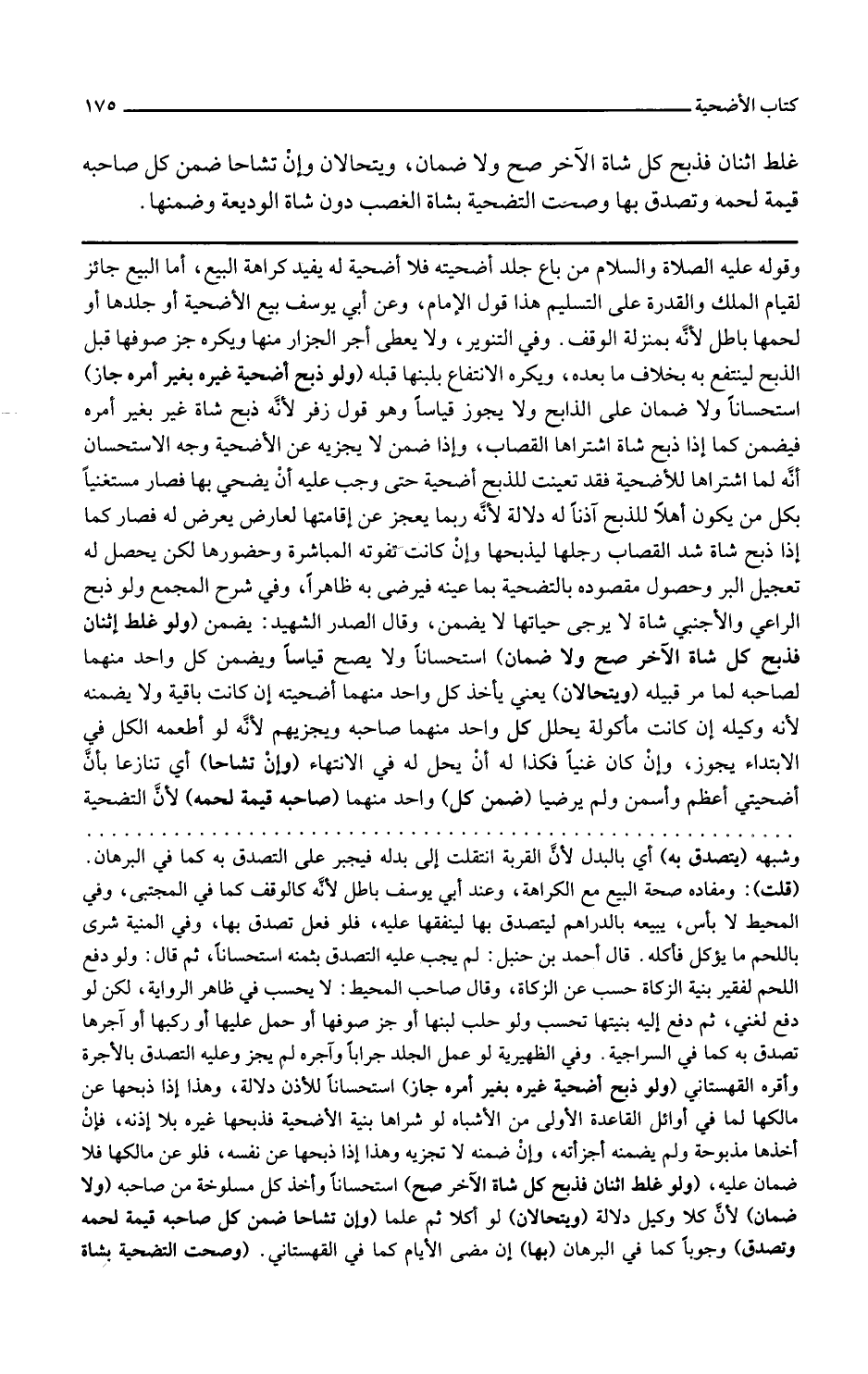 ولو غلط اثنان فذبح كل شاة الآخر صح ولا ضمان استحسانا ولا يصح قياسا ويضمن كل واحد منهما لصاحبه لما مر قبيله ويتحالان يعني يأخذ كل واحد منهما أضحيته إن كانت باقية ولا يضمنه لأنه وكيله إن كانت مأكولة يحلل كل واحد منهما صاحبه ويجريهم لأنه لو أطعمه الكل في الابتداء يجوز وإن كان غنيا فكذا له أن يحل له في الانتهاء وإن تشاحا أي تنازعا بأن أضحيتي أعظم وأسمن ولم يرضيا ضمن كل واحد منهما صاحبه قيمة لحمه لأن التضحية