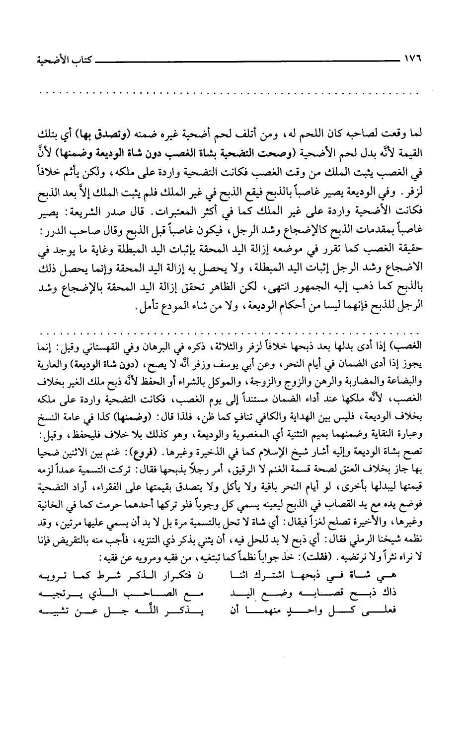 وصحت التضحية بشاة الغصب دون شاة الوديعة وضمنها لأن في الغصب يثبت الملك من وقت الغصب فكانت التضحية واردة على ملكه ولكن يأثم خلافا لزفر وفي الوديعة يصير غاصبا بالذبح فيقع الذبح في غير الملك فلم يثبت الملك إلا بعد الذبح فكانت الأضحية واردة على غير الملك كما في أكثر المعتبرات قال صدر الشريعة يصير غاصبا بمقدمات الذبح كالإضجاع وشد الرجل فيكون غاصبا قبل الذبح