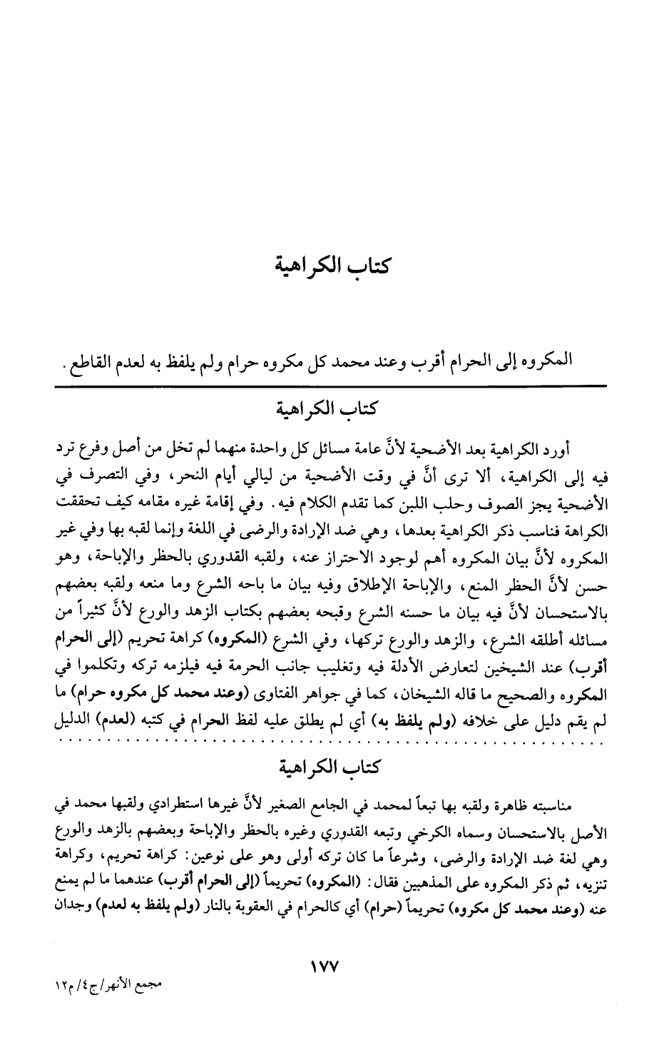 وفي الشرع المكروه كراهة تحريم إلى الحرام أقرب عند الشيخين لتعارض الأدلة فيه وتغليب جانب الحرمة فيه فيلزمه تركه وتكلموا في المكروه والصحيح ما قاله الشيخان كما في جواهر الفتاوى وعند محمد كل مكروه حرام ما لم يقم دليل على خلافه ولم يلفظ به أي لم يطلق عليه لفظ الحرام في كتبه لعدم الدليل