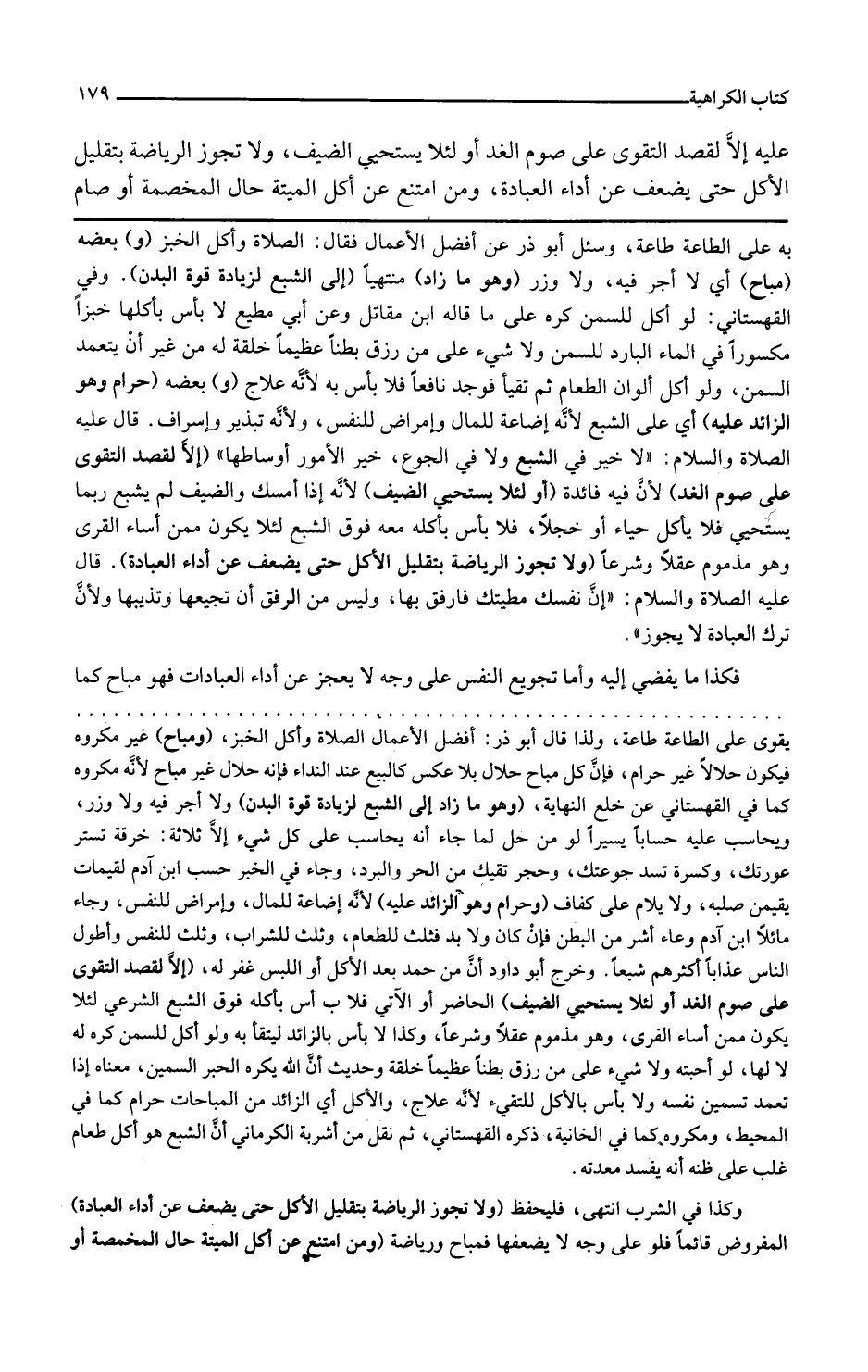 و بعضه حرام وهو الزائد عليه أي على الشبع لأنه إضاعة للمال وأمراض للنفس ولأنه تبذير وإسراف قال عليه الصلاة والسلام لا خير في الشبع ولا في الجوع خير الأمور أوساطها إلا لقصد التقوى على صوم الغد لأن فيه فائدة أو لئلا يستحي الضيف لأنه إذا أمسك والضيف لم يشبع ربما يستحي فلا يأكل حياء أو خجلا فلا بأس بأكله معه فوق الشبع لئلا يكون ممن أساء القرى وهو مذموم عقلا وشرعا ولا تجوز الرياضة بتقليل الأكل حتى يضعف عن أداء العبادة قال عليه الصلاة والسلام إن نفسك مطيتك فارفق بها وليس من الرفق أن تجيعها وتذيبها ولأن ترك العبادة لا يجوز فكذا ما يفضي إليه وأما تجويع النفس على وجه لا يعجز عن أداء العبادات فهو مباح كما