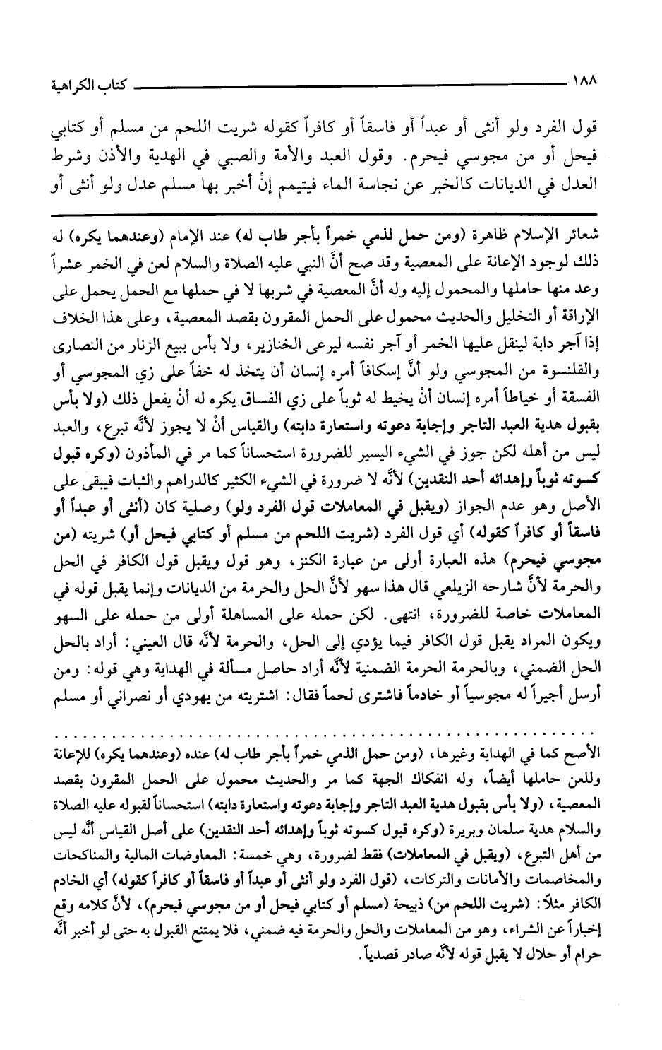 ويقبل في المعاملات قول الفرد ولو وصلية كان أنثى أو عبدا أو فاسقا أو كافرا كقوله أي قول الفرد شريت اللحم من مسلم أو كتابي فيحل أو شريته من مجوسي فيحرم هذه العبارة أولى من عبارة الكنز وهو قوله ويقبل قول الكافر في الحل والحرمة لأن شارحه الزيلعي قال هذا سهو لأن الحل والحرمة من الديانات وإنما يقبل قوله في المعاملات خاصة للضرورة انتهى لكن حمله على المساهلة أولى من حمله على السهو ويكون المراد يقبل قول الكافر فيما يؤدي إلى الحل والحرمة لأنه قال العيني أراد بالحل الحل الضمني وبالحرمة الحرمة الضمنية لأنه أراد حاصل مسألة في الهداية وهي قوله ومن أرسل أجيرا له مجوسيا أو خادما فاشترى لحما فقال اشتريته من يهودي أو نصراني أو مسلم