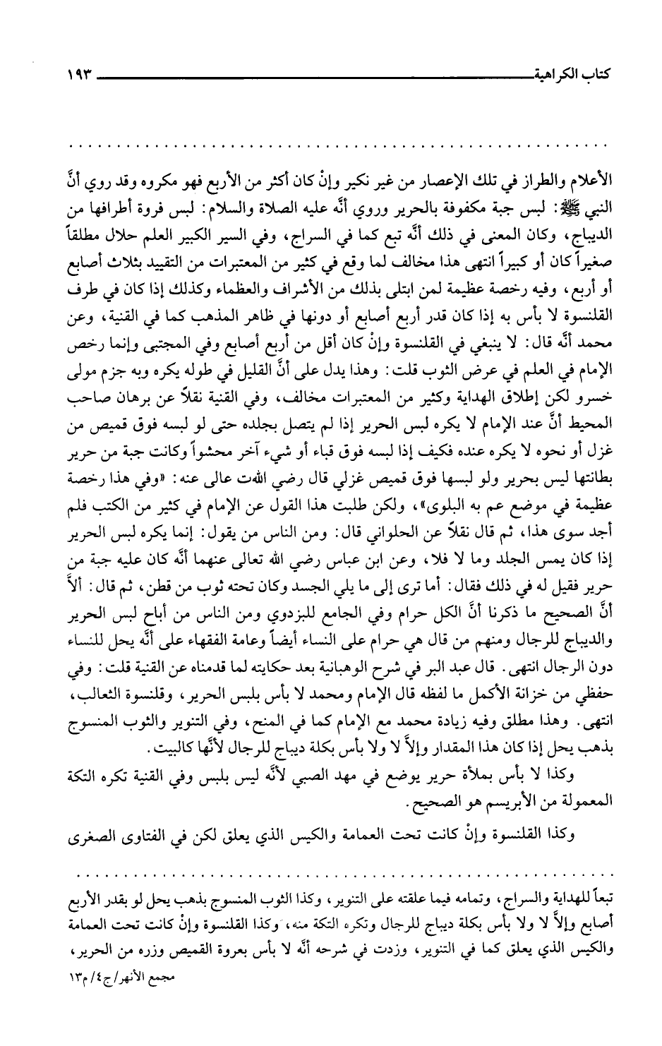 الأعلام والطراز في تلك الأعصار من غير نكير وإن كان أكثر من الأربع فهو مكروه وقد روي أن النبي صلى الله تعالى عليه وسلم لبس جبة مكفوفة بالحرير وروي أنه عليه الصلاة والسلام لبس فروة أطرافها من الديباج وكان المعنى في ذلك أنه تبع كما في السراج وفي السير الكبير العلم حلال مطلقا صغيرا كان أو كبيرا انتهى هذا مخالف لما وقع في كثير من المعتبرات من التقييد بثلاث أصابع أو أربع وفيه رخصة عظيمة لمن ابتلي بذلك من الأشراف والعظماء وكذلك إذا كان في طرف القلنسوة لا بأس به إذا كان قدر أربع أصابع أو دونها في ظاهر المذهب كما في القنية وعن محمد أنه قال لا ينبغي ذلك في القلنسوة وإن كان أقل من أربع أصابع وفي المجتبي وإنما رخص الإمام في العلم في عرض الثوب قلت وهذا يدل على أن القليل في طوله يكره وبه جزم مولى خسرو ولكن إطلاق الهداية وكثير من المعتبرات مخالف