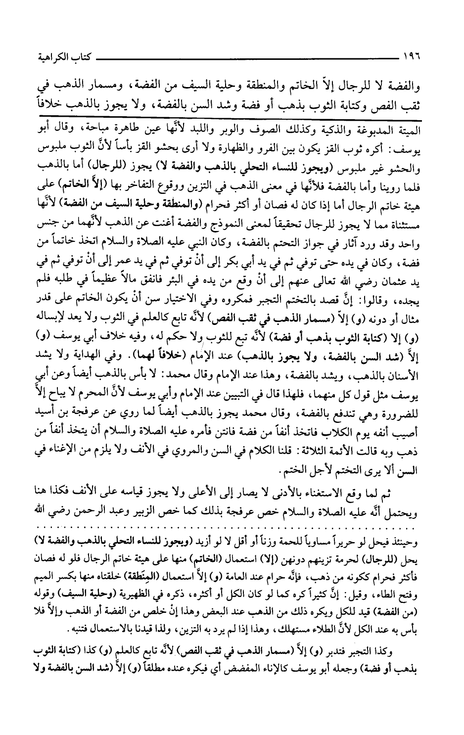 ويجوز للنساء التحلي بالذهب والفضة لا يجوز للرجال أما بالذهب فلما روينا وأما بالفضة فلأنها في معنى الذهب في التزين ووقوع التفاخر بها إلا الخاتم على هيئة خاتم الرجال أما إذا كان له فصان أو أكثر فحرام والمنطقة وحلية السيف من الفضة لأنها مستثناة مما لا يجوز للرجال تحقيقا لمعنى النموذج والفضة أغنت عن الذهب لأنهما من جنس واحد وقد ورد آثار في جواز التختم بالفضة وكان النبي عليه الصلاة والسلام اتخذ خاتما من فضة وكان في يده حتى توفي ثم في يد أبي بكر إلى أن توفي ثم في يد عمر إلى أن توفي ثم في يد عثمان رضي الله تعالى عنهم إلى أن وقع من يده في البئر فأنفق مالا عظيما في طلبه فلم يجده وقالوا إن قصد بالتختم التجبر فمكروه