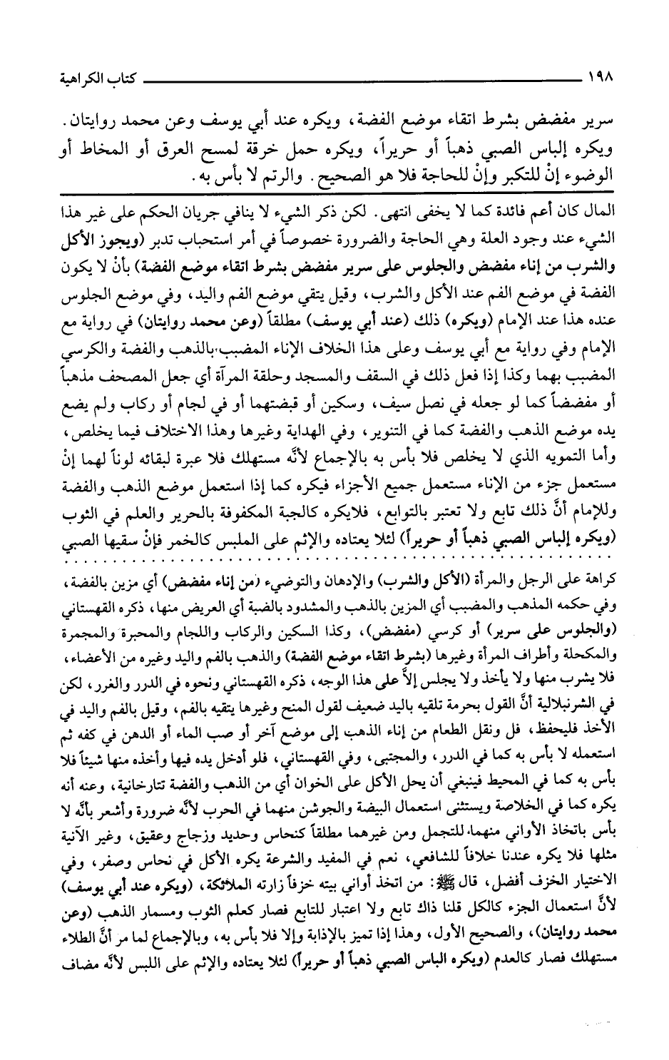 وفي رواية مع أبي يوسف وعلى هذا الخلاف الإناء المضبب بالذهب والفضة والكرسي المضبب بهما وكذا إذا فعل ذلك في السقف والمسجد وحلقة المرآة أي جعل المصحف مذهبا أو مفضضا كما لو جعله في نصل سيف وسكين أو قبضتهما أو في لجام أو ركاب ولم يضع يده موضع الذهب والفضة كما في التنوير وفي الهداية وغيرها وهذا الاختلاف فيما يخلص وأما التمويه الذي لا يخلص فلا بأس به بالإجماع لأنه مستهلك فلا عبرة لبقائه لونا لهما إن مستعمل جزء من الإناء مستعمل جميع الأجزاء فيكره كما إذا استعمل موضع الذهب والفضة وللإمام أن ذلك تابع ولا تعتبر بالتوابع فلا يكره كالجبة المكفوفة بالحرير والعلم في الثوب