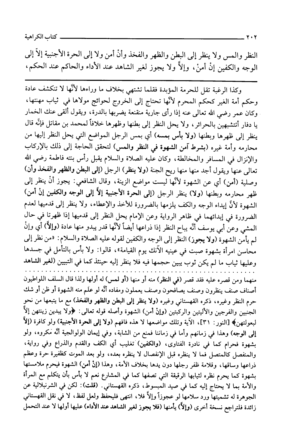 ولا ينظر الرجل إلى الحرة الأجنبية إلا إلى الوجه والكفين إن أمن الشهوة لأن إبداء الوجه والكف يلزمها بالضرورة للأخذ والإعطاء ولا ينظر إلى قدميها لعدم الضرورة في إبدائهما في ظاهر الرواية وعن الإمام يحل النظر إلى قدميها إذا ظهرتا في حال المشي وعن أبي يوسف أنه يباح النظر إلى ذراعها أيضا لأنها قدر يبدو منها عادة وإلا أي وإن لم يأمن الشهوة ولا يجوز النظر إلى الوجه والكفين لقوله عليه الصلاة والسلام من نظر إلى محاسن امرأة بشهوة صبت في عينيه الآنك يوم القيامة قالوا ولا بأس بالتأمل في جسدها وعليها ثياب ما لم يكن ثوب يبين حجمها فيه فلا ينظر إليه حينئذ كما في التبيين لغير الشاهد
