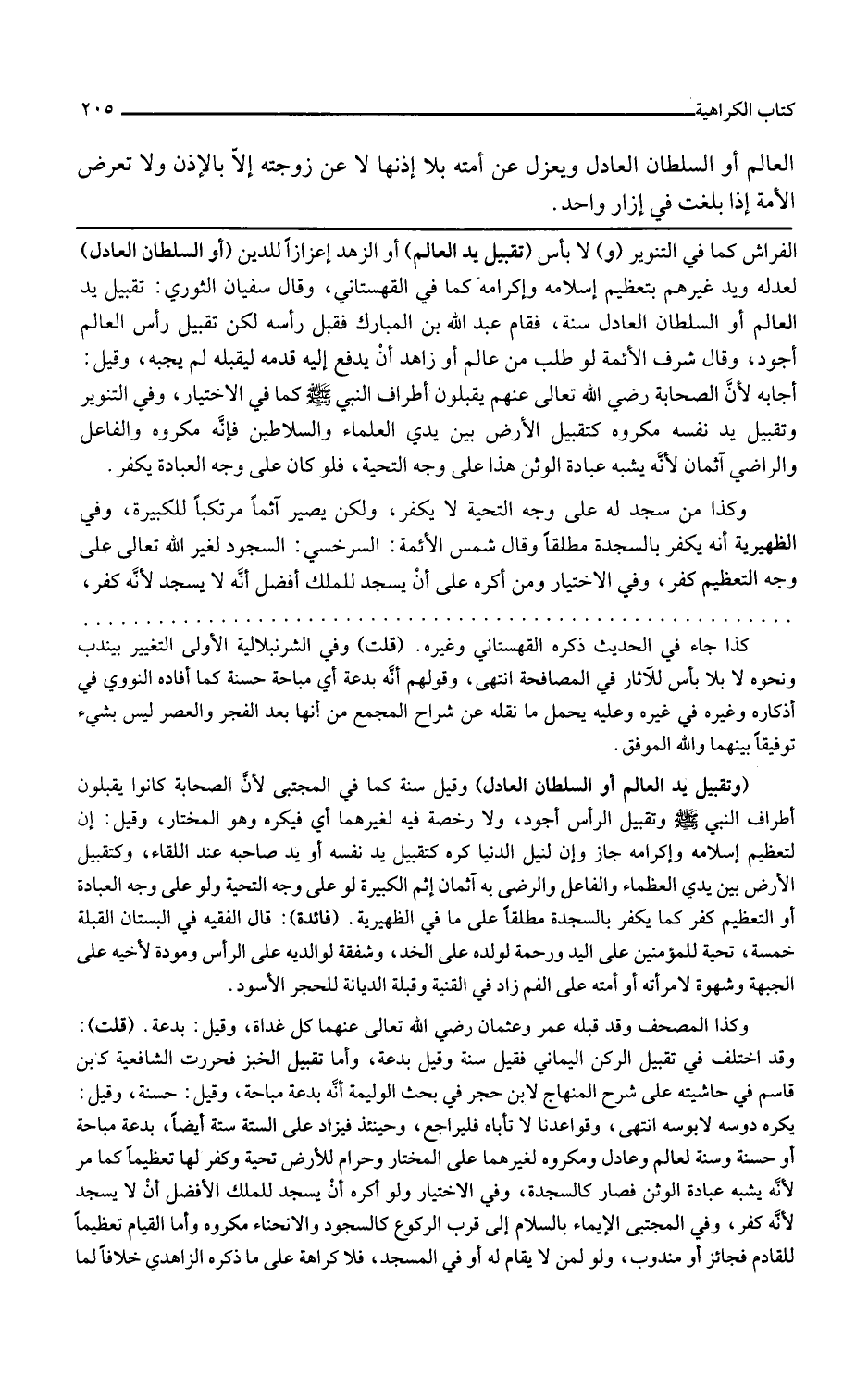 و لا بأس تقبيل يد العالم أو الزاهد إعزازا للدين أو السلطان العادل لعدله ويد غيرهم بتعظيم إسلامه وإكرامه كما في القهستاني وقال سفيان الثوري تقبيل يد العالم أو السلطان العادل سنة فقام عبد الله بن مبارك فقبل رأسه لكن تقبيل رأس العالم أجود