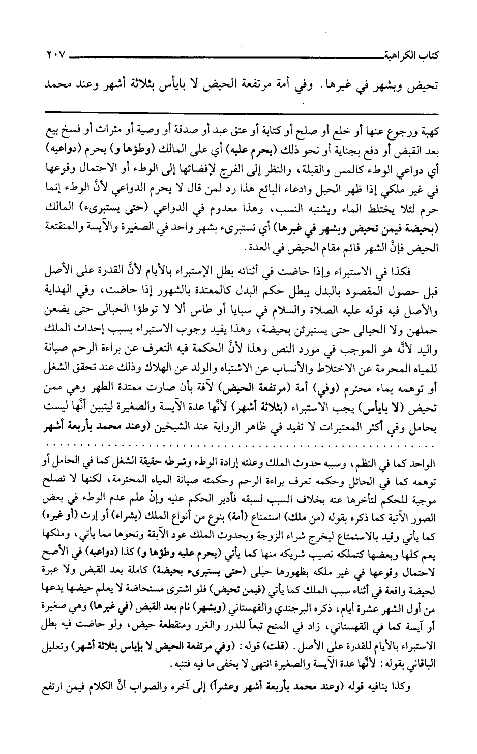 وفي أمة مرتفعة الحيض لآفة بأن صارت ممتدة الطهر وهي ممن تحيض لا بإياس يجب الاستبراء بثلاثة أشهر لأنها عدة الآيسة والصغيرة ليتبين أنها ليست بحامل وفي أكثر المعتبرات لا تفيد في ظاهر الرواية عند الشيخين وعند محمد بأربعة أشهر