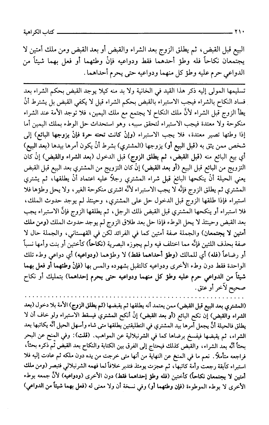 وإن كانت تحته حرة فأن يزوجها البائع إلى شخص ممن يثق به قبل البيع أو يزوجها المشتري بشرط أن يكون أمرها بيدها بعد البيع أي بيع البائع منه قبل القبض ثم يطلق الزوج قبل الدخول بعد الشراء والقبض إن كان التزويج من البائع قبل البيع أو بعد القبض إن كان التزويج من المشتري بعد البيع قبل القبض يعني الحيلة أن ينكحها البائع قبل شراء المشتري رجلا عليه اعتماد أن يطلقها ثم يشتري المشتري ثم يطلق الزوج فإنه لا يجب الاستبراء لأنه اشترى منكوحة الغير ولا يحل وطؤها فلا استبراء فإذا طلقها الزوج قبل الدخول حل على المشتري وحينئذ لم يوجد حدوث الملك فلا استبراء أو ينكحها المشتري قبل القبض ذلك الرجل ثم يطلقها الزوج فإن الاستبراء يجب بعد القبض وحينئذ لا يحل الوطء فإذا حل بعد طلاق الزوج لم يوجد حدوث الملك