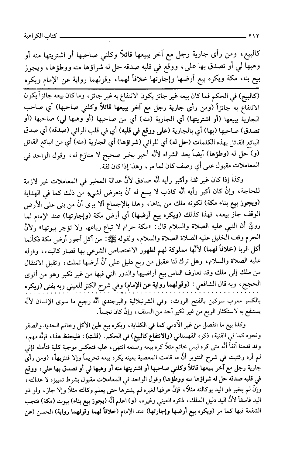 ويجوز بيع بناء مكة لكونه ملك من بناها وهذا بالإجماع ألا يرى أن من بنى على الأرض الوقف جاز بيعه فهذا كذلك ويكره بيع أرضها أي أرض مكة وإجارتها عند الإمام لما روي أن النبي عليه الصلاة والسلام قال مكة حرام لا تباع رباعها ولا تؤجر بيوتها ولأن الحرم وقف الخليل عليه الصلاة والسلام ولقوله صلى الله تعالى عليه وسلم من أكل أجور أرض مكة فكأنما أكل الربا خلافا لهما لأنها مملوكة لهم لظهور الاختصاص الشرعي بها فصار كالبناء وقوله عليه الصلاة والسلام وهل ترك لنا عقيل من ربع دليل على أن أرضها تملك وتقبل الانتقال من ملك إلى ملك وقد تعارف الناس بيع أراضيها والدور التي فيها من غير نكير وهو من أقوى الحجج وبه قال الشافعي وقولهما رواية عن الإمام