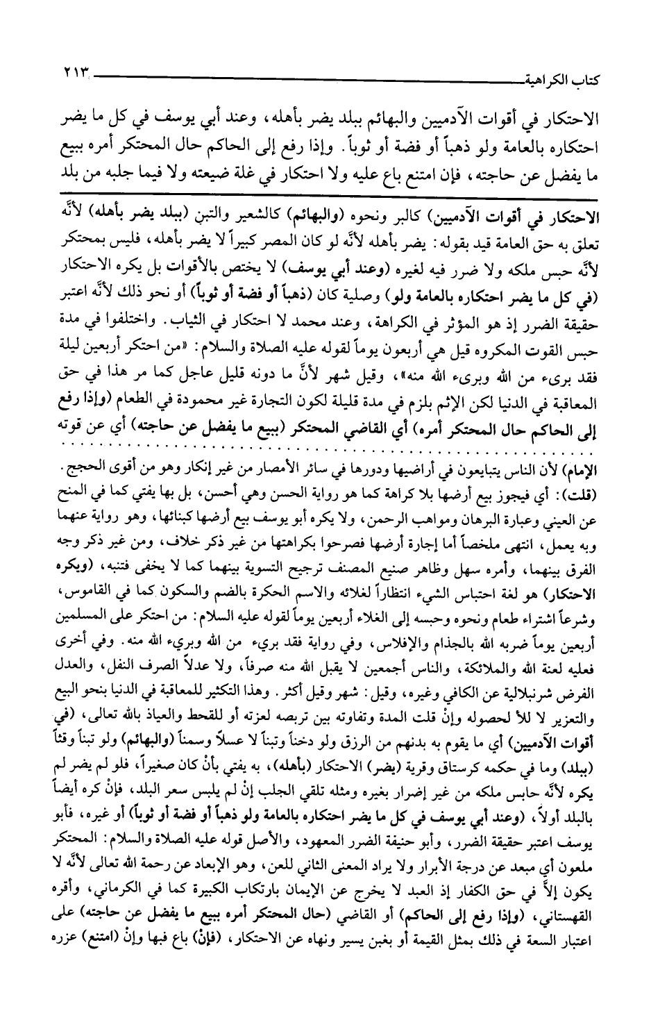 الاحتكار في أقوات الآدميين كالبر ونحوه والبهائم كالشعير والتبن ببلد يضر بأهله لأنه تعلق به حق العامة قيد بقوله يضر بأهله لأنه لو كان المصر كبيرا لا يضر بأهله فليس بمحتكر لأنه حبس ملكه ولا ضرر فيه لغيره وعند أبي يوسف لا يختص بالأقوات بل يكره الاحتكار في كل ما يضر احتكاره بالعامة ولو وصلية كان ذهبا أو فضة أو ثوبا أو نحو ذلك لأنه اعتبر حقيقة الضرر إذ هو المؤثر في الكراهة وعند محمد لا احتكار في الثياب