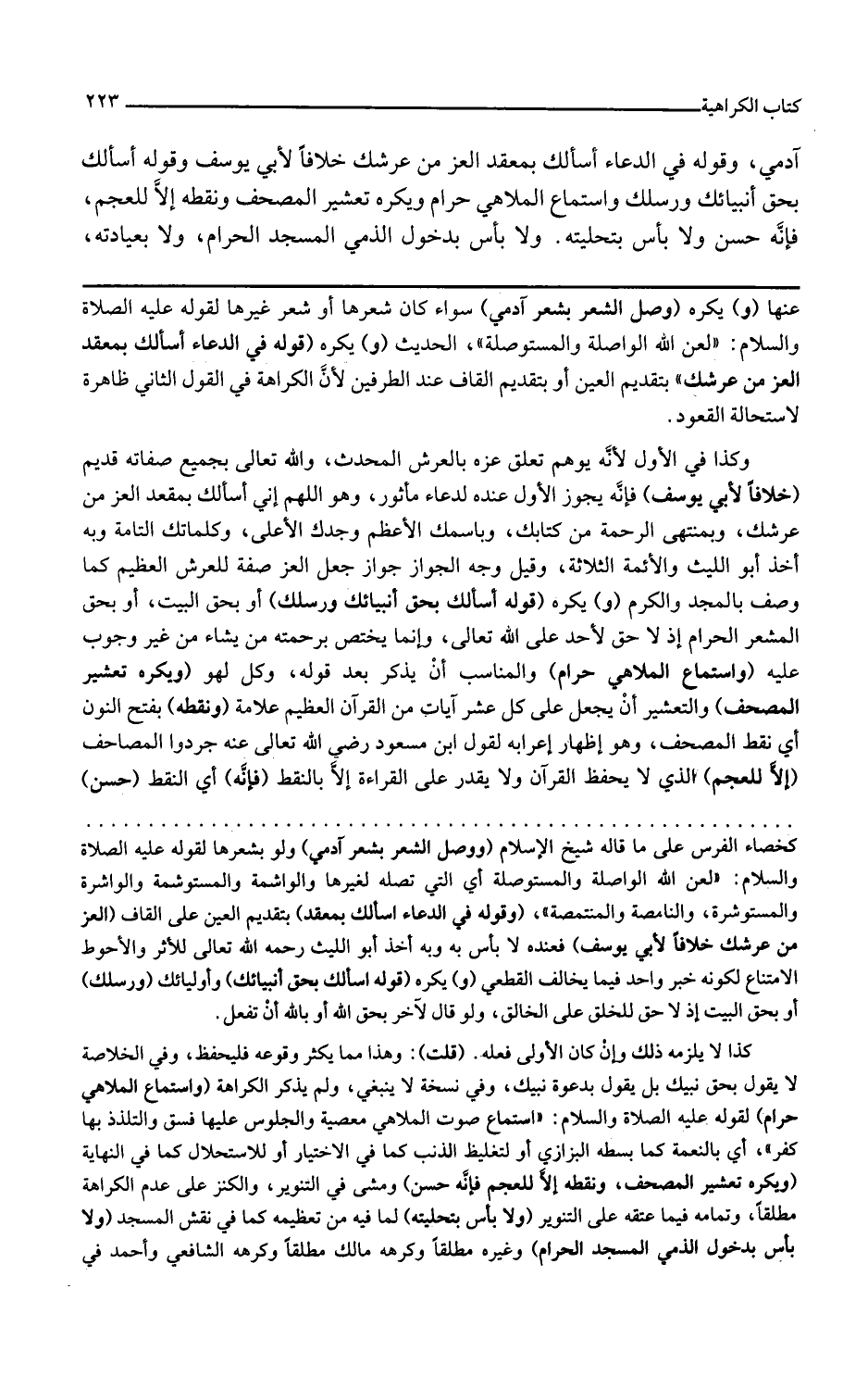 و ويكره قوله في الدعاء أسألك بمعقد العز من عرشك بتقديم العين أو بتقديم القاف عند الطرفين لأن الكراهة في القول الثاني ظاهرة لاستحالة القعود وكذا في الأول لأنه يوهم تعلق عزه بالعرش المحدث والله تعالى بجميع صفاته قديم خلافا لأبي يوسف فإنه يجوز الأول عنده لدعاء مأثور وهو اللهم إني أسألك بمعقد العز من عرشك وبمنتهى الرحمة من كتابك وباسمك الأعظم وجدك الأعلى وكلماتك التامة وبه أخذ أبو الليث والأئمة الثلاثة وقيل وجه الجواز جواز جعل العز صفة للعرش العظيم كما وصف بالمجد والكرم
