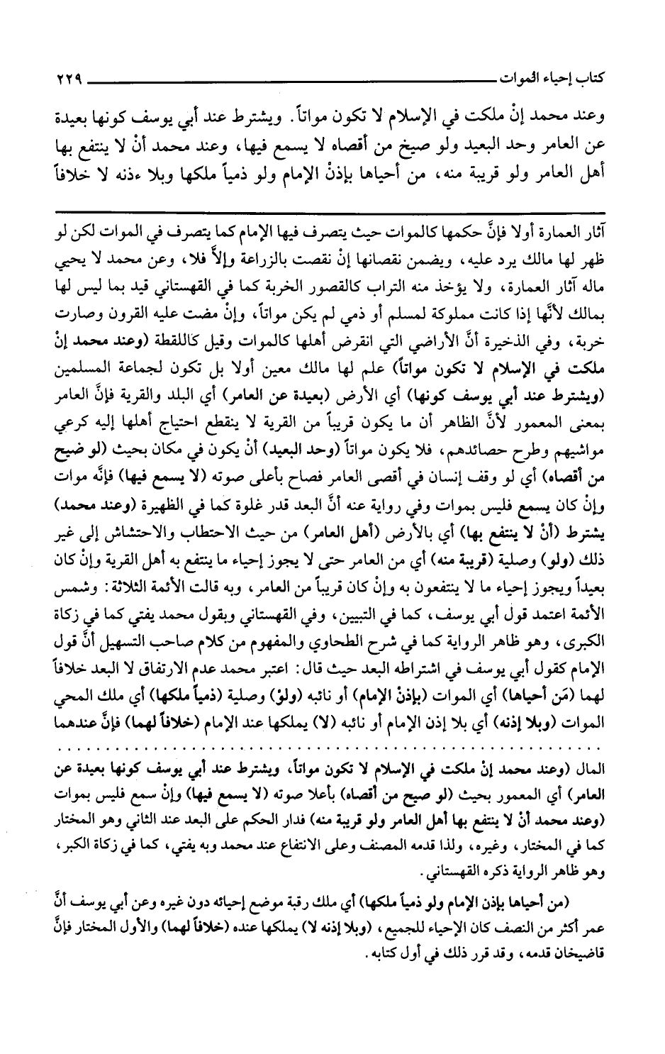 وفي القهستاني وبقول محمد يفتى كما في زكاة الكبرى وهو ظاهر الرواية كما في شرح الطحاوي والمفهوم من كلام صاحب التسهيل أن قول الإمام كقول أبي يوسف في اشتراطه البعد حيث قال اعتبر محمد عدم الارتفاق لا البعد خلافا لهما من أحياها أي الموات بإذن الإمام أو نائبه ولو وصلية ذميا ملكها أي ملك المحيي الموات وبلا إذنه أي بلا إذن الإمام أو نائبه لا يملكها عند الإمام خلافا لهما فإن عندهما