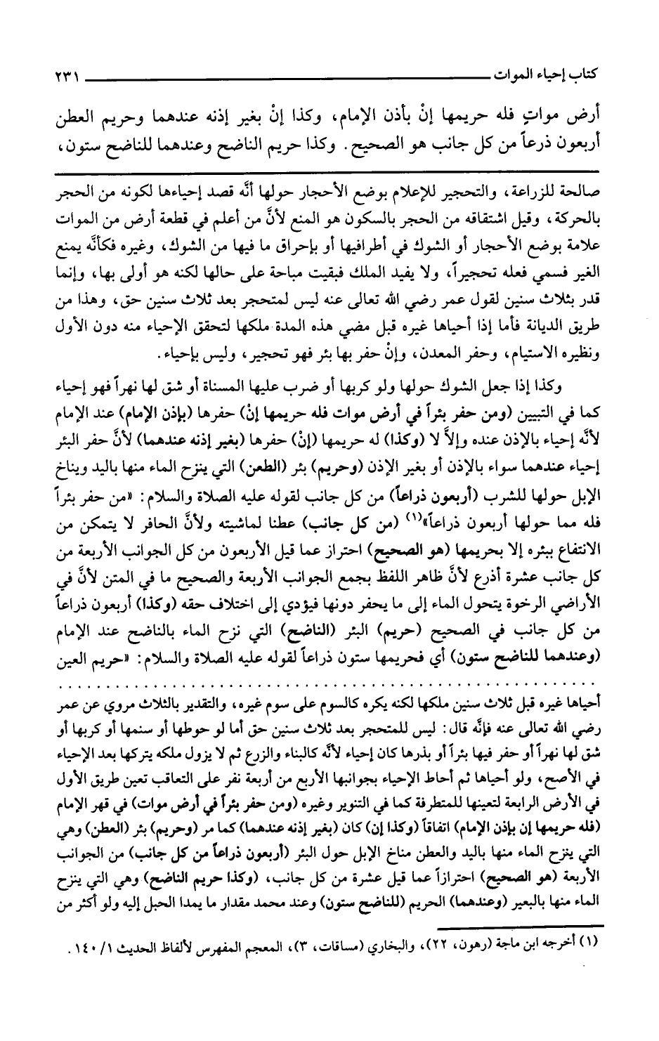 وكذا أربعون ذراعا من كل جانب في الصحيح حريم البئر الناضح التي نزح الماء بالناضح عند الإمام وعندهما للناضح ستون أي فحريمها ستون ذراعا لقوله عليه الصلاة والسلام حريم العين
