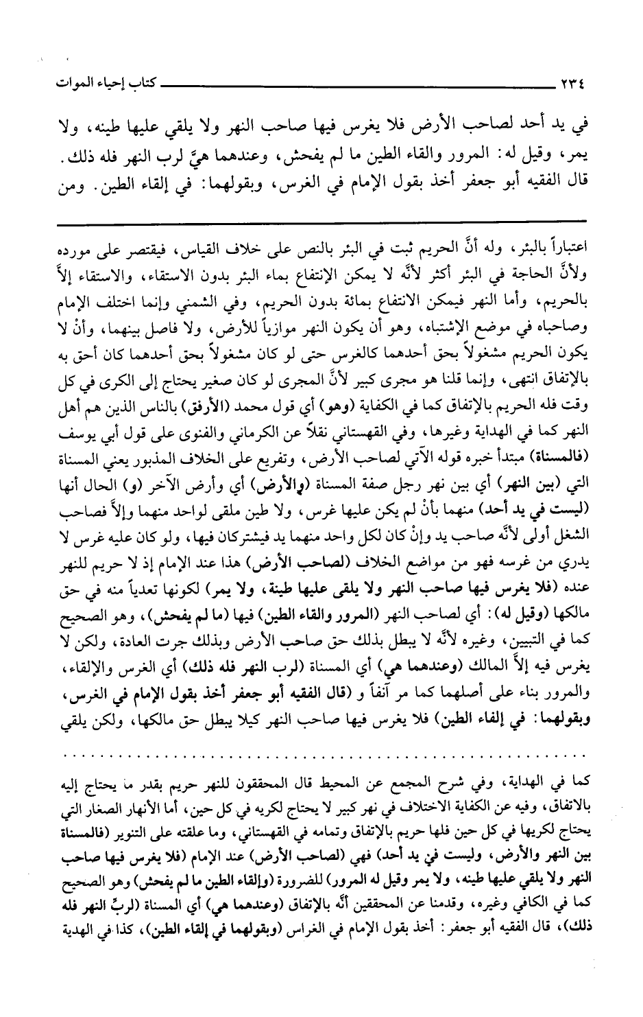 و الحال أنها ليست في يد أحد منهما بأن لم يكن عليها غرس ولا طين ملقى لواحد منهما وإلا فصاحب الشغل أولى لأنه صاحب يد وإن كان لكل واحد منهما يد فيشتركان فيها ولو كان عليه غرس لا يدرى من غرسه فهو من مواضع الخلاف لصاحب الأرض هذا عند الإمام إذ لا حريم للنهر عنده فلا يغرس فيها صاحب النهر ولا يلقي عليها طينه ولا يمر لكونها تعديا منه في حق مالكها وقيل له أي لصاحب النهر المرور وإلقاء الطين فيها ما لم يفحش وهو الصحيح كما في التبيين وغيره لأنه لا يبطل بذلك حق صاحب الأرض وبذلك جرت العادة ولكن لا يغرس فيه إلا المالك وعندهما هي أي المسناة لرب النهر فله ذلك أي الغرس والإلقاء والمرور بناء على أصلهما كما مر آنفا و قال الفقيه أبو جعفر أخذ بقول الإمام في الغرس وبقولهما في إلقاء الطين فلا يغرس فيها صاحب النهر كي لا يبطل حق مالكها ولكن يلقي
