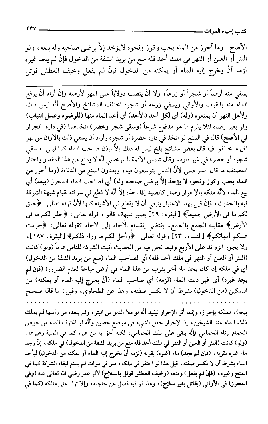 ولو كانت البئر أو العين أو النهر في ملك أحد فله أي لصاحب الماء منع من يريد الشفة من الدخول أي في ملكه إذا كان يجد ماء آخر بقرب من هذا الماء في أرض مباحة لعدم الضرورة فإن لم يجد غيره أي غير ذلك الماء لزمه أي صاحب الماء أن يخرج إليه الماء أو يمكنه من التمكين من الدخول بشرط أن لا يكسر صفته وهذا عن الطحاوي وقيل ما قاله صحيح