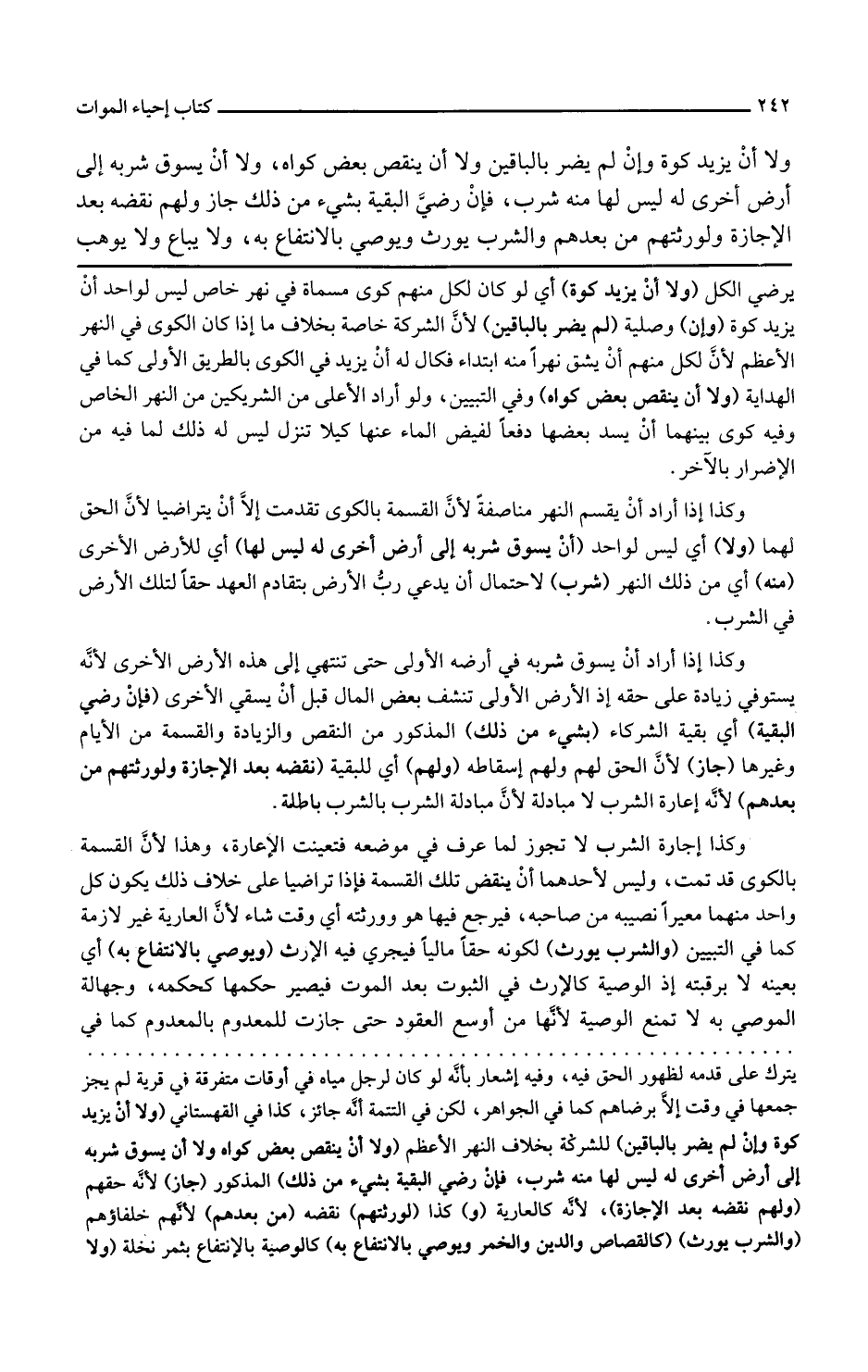 وفي التبيين ولو أراد الأعلى من الشريكين من النهر الخاص وفيه كوى بينهما أن يسد بعضها دفعا لفيض الماء عنها كي لا تنزل ليس له ذلك لما فيه من الإضرار بالآخر وكذا إذا أراد أن يقسم النهر مناصفة لأن القسمة بالكوى تقدمت إلا أن يتراضيا لأن الحق لهما