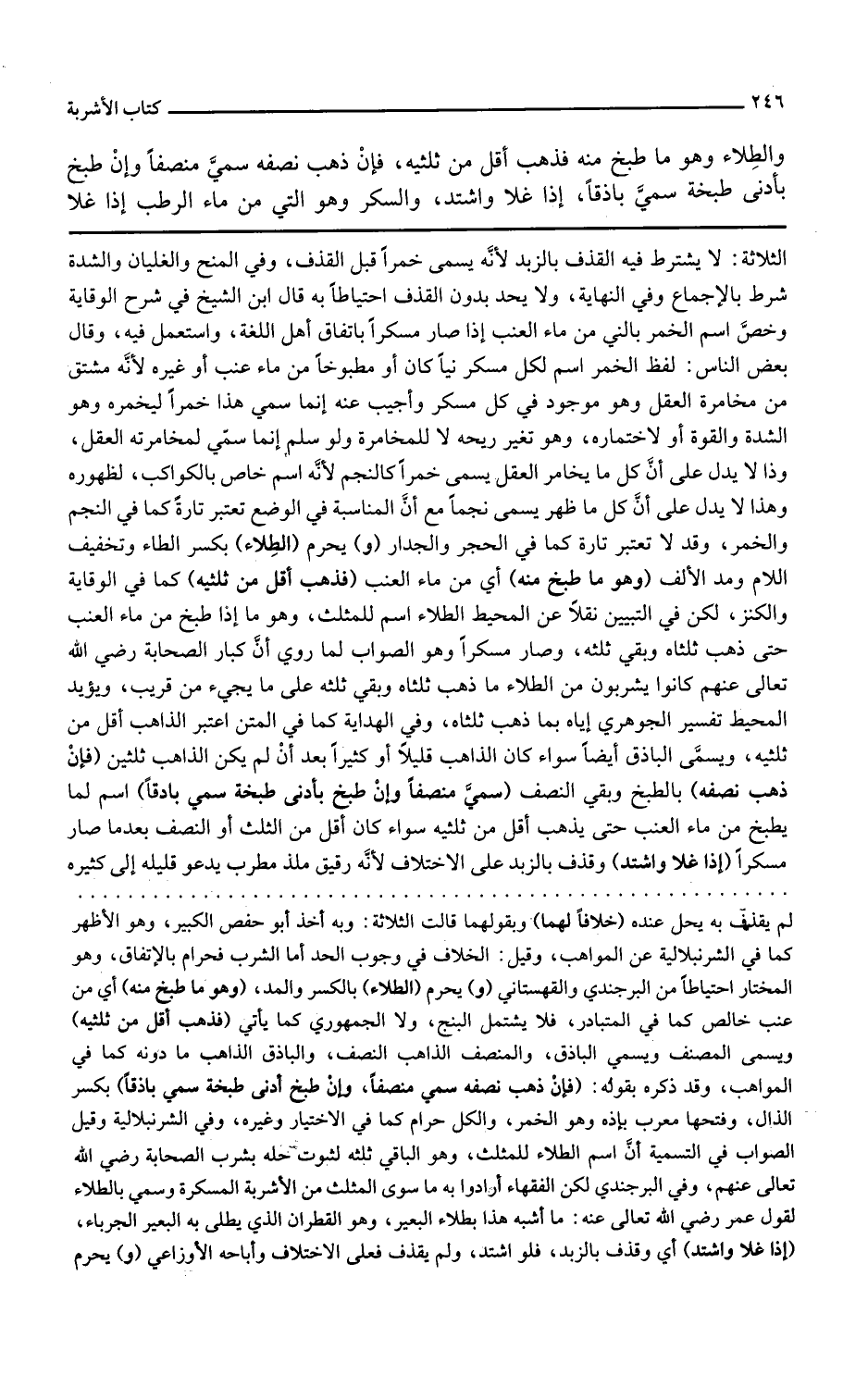 و يحرم الطلاء بكسر الطاء وتخفيف اللام ومد الألف وهو ما طبخ منه أي من ماء العنب فذهب أقل من ثلثيه كما في الوقاية والكنز لكن في التبيين نقلا عن المحيط الطلاء اسم للمثلث وهو ما إذا طبخ من ماء العنب حتى ذهب ثلثاه وبقي ثلثه وصار مسكرا وهو الصواب لما روي أن كبار الصحابة رضي الله تعالى عنهم كانوا يشربون من الطلاء ما ذهب ثلثاه وبقي ثلثه على ما يجيء من قريب ويؤيد المحيط تفسير الجوهري إياه بما ذهب ثلثاه