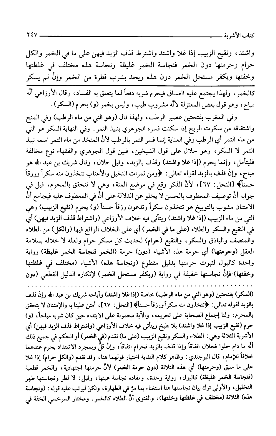 و يحرم نقيع الزبيب وهي الأحمز من ماء الزبيب إذا غلا واشتد ويتأتى فيه خلاف الأوزاعي واشترط قذف الزبد فيهن أي في النقيع والسكر والطلاء على ما في الخمر أي على الخلاف الواقع فيها والكل من الطلاء والمنصف والباذق والسكر والنقيع حرام لحديث كل مسكر حرام ولعله لإخلاله بسلامة العقل وحرمتها أي حرمة هذه الأشياء دون حرمة الخمر فنجاسة الخمر غليظة رواية واحدة كالبول لثبوت حرمتها بدليل مقطوع ونجاسة هذه الأشياء مختلف في غلظتها وخفتها فإن نجاستها خفيفة في رواية
