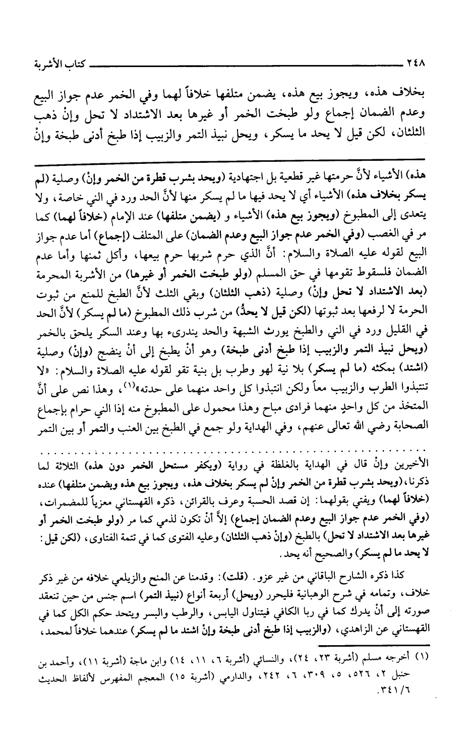هذه الأشياء لأن حرمتها غير قطعية بل اجتهادية ويحد بشرب قطرة من الخمر وإن وصلية لم يسكر بخلاف هذه الأشياء أي لا يحد فيها ما لم يسكر منها لأن الحد ورد في الني خاصة ولا يتعدى إلى المطبوخ ويجوز بيع هذه الأشياء و ويضمن متلفها عند الإمام خلافا لهما كما مر في الغصب وفي الخمر عدم جواز البيع وعدم الضمان على المتلف إجماع أما عدم جواز البيع لقوله عليه الصلاة والسلام إن الذي حرم شربها حرم بيعها وأكل ثمنها وأما عدم الضمان فلسقوط تقومها في حق المسلم ولو طبخت الخمر أو غيرها من الأشربة المحرمة بعد الاشتداد لا تحل وإن وصلية ذهب الثلثان وبقي الثلث لأن الطبخ للمنع من ثبوت الحرمة لا لرفعها بعد ثبوتها لكن قيل لا يحد من شرب ذلك المطبوخ ما لم يسكر لأن الحد في القليل ورد في الني والطبخ يورث الشبهة والحد يندرئ بها وعند السكر يلحق بالخمر