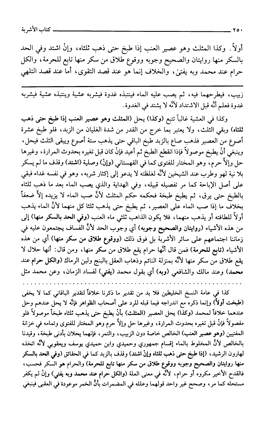 وكذا يحل المثلث وهو عصير العنب إذا طبخ حتى ذهب ثلثاه وبقي الثلث ولا يعتبر بما خرج من القدر من شدة الغليان من الزبد فلو طبخ عشرة أصوع من العصير فذهب صاع بالزبد طبخ الباقي حتى يذهب ستة أصوع ويبقى الثلث فيحل وينبغي أن يطبخ موصولا فإذا انقطع الطبخ ثم أعيد فإن كان قبل تغيره بحدوث المرارة وغيرها حل وإلا حرم وهو المختار للفتوى كما في القهستاني