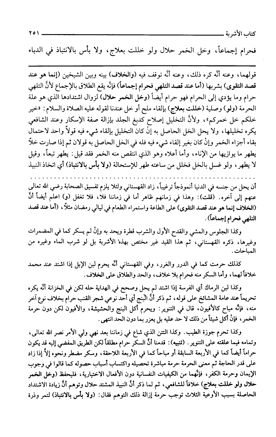 قولهما وعنه أنه كره ذلك وعنه أنه توقف فيه والخلاف بينه وبين الشيخين إنما هو عند قصد التقوي بشربها أما عند قصد التلهي فحرام إجماعا فإنه يقع الطلاق بالإجماع لأن التلهي حرام وما يؤدي إلى الحرام فهو حرام أيضا