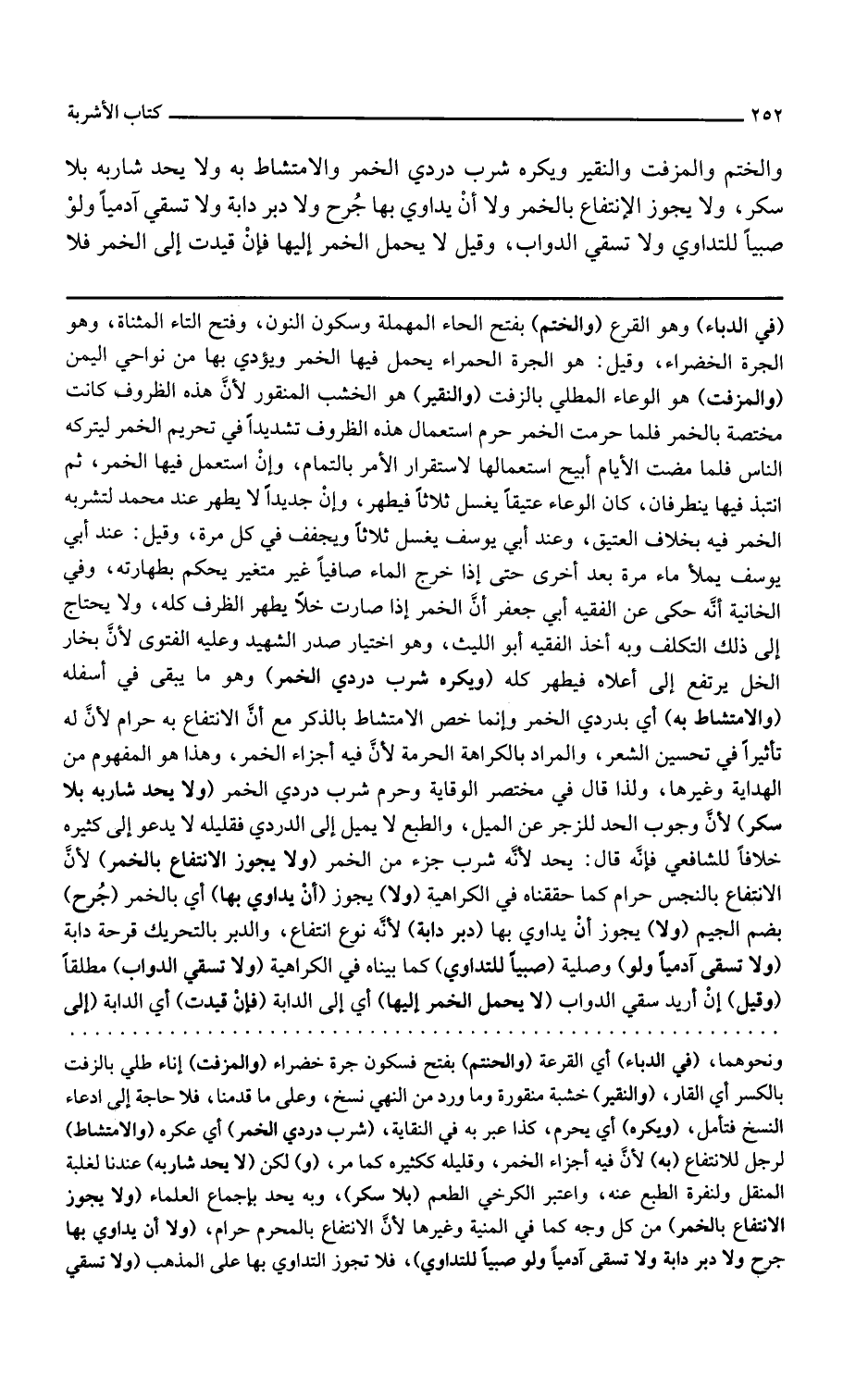 ويكره شرب دردي الخمر وهو ما يبقى في أسفله والامتشاط به أي بدردي الخمر وإنما خص الامتشاط بالذكر مع أن الانتفاع به حرام لأن له تأثيرا في تحسين الشعر والمراد بالكراهة الحرمة لأن فيه أجزاء الخمر وهذا هو المفهوم من الهداية وغيرها ولذا قال في مختصر الوقاية وحرم شرب دردي الخمر ولا يحد شاربه بلا سكر لأن وجوب الحد للزجر عن الميل والطبع لا يميل إلى الدردي فقليله لا يدعو إلى كثيره خلافا للشافعي فإنه قال يحد لأنه شرب جزء من الخمر