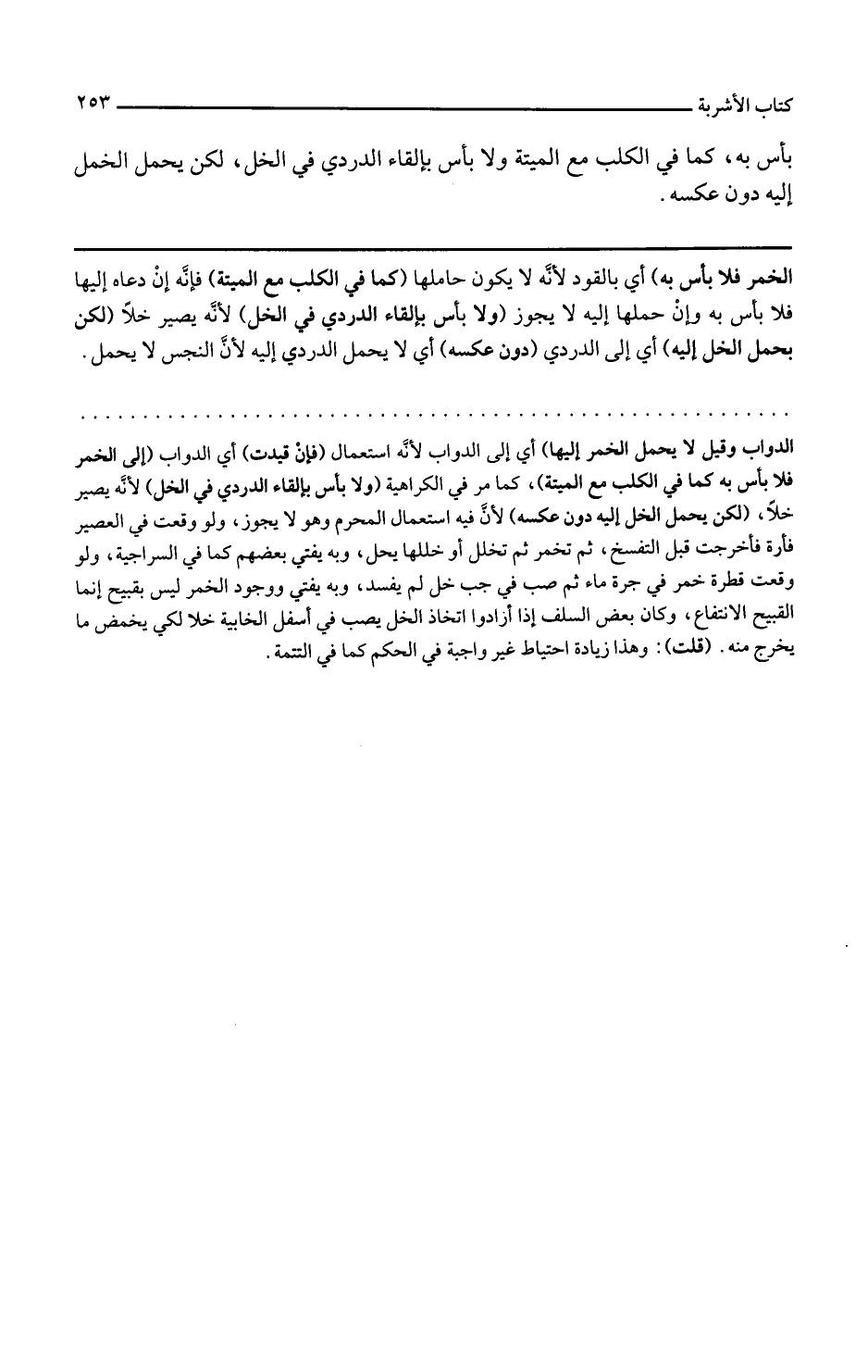 الخمر فلا بأس به أي بالقود لأنه لا يكون حاملها كما في الكلب مع الميتة فإنه إن دعاه إليها فلا بأس به وإن حملها إليه لا يجوز ولا بأس بإلقاء الدردي في الخل لأنه يصير خلا لكن بحمل الخل إليه أي إلى الدردي دون عكسه أي لا يحمل الدردي إليه لأن النجس لا يحمل