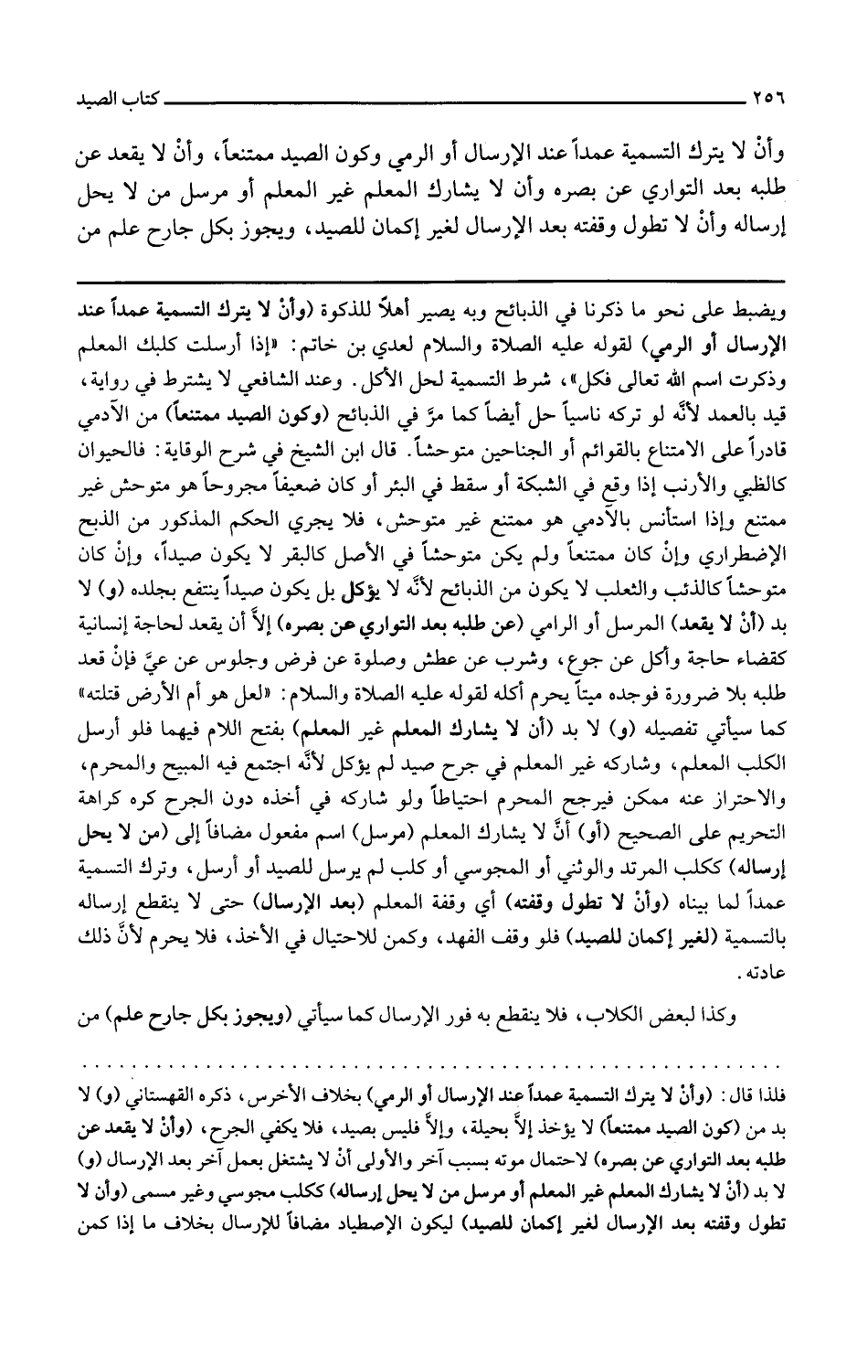 و لا بد أن لا يقعد المرسل أو الرامي عن طلبه بعد التواري عن بصره إلا أن يقعد لحاجة إنسانية كقضاء حاجة وأكل عن جوع وشرب عن عطش وصلاة عن فرض وجلوس عن عي فإن قعد طلبه بلا ضرورة فوجده ميتا يحرم أكله لقوله عليه الصلاة والسلام لعل هوام الأرض قتلته كما سيأتي تفصيله و لا بد أن لا يشارك المعلم غير المعلم بفتح اللام فيهما فلو أرسل الكلب المعلم وشاركه غير المعلم في جرح صيد لم يؤكل لأنه اجتمع فيه المبيح والمحرم والاحتراز عنه ممكن فيرجح المحرم احتياطا ولو شاركه في أخذه دون الجرح كره كراهة التحريم على الصحيح أو أن لا يشارك المعلم مرسل اسم مفعول مضافا إلى من لا يحل إرساله ككلب المرتد والوثني أو المجوسي أو كلب لم يرسل للصيد أو أرسل وترك التسمية عمدا لما بيناه وأن لا تطول وقفته أي وقفة المعلم بعد الإرسال حتى لا ينقطع إرساله بالتسمية لغير إمكان للصيد فلو وقف الفهد وكمن للاحتيال في الأخذ فلا يحرم لأن ذلك عادته وكذا لبعض الكلاب فلا ينقطع به فور الإرسال كما سيأتي