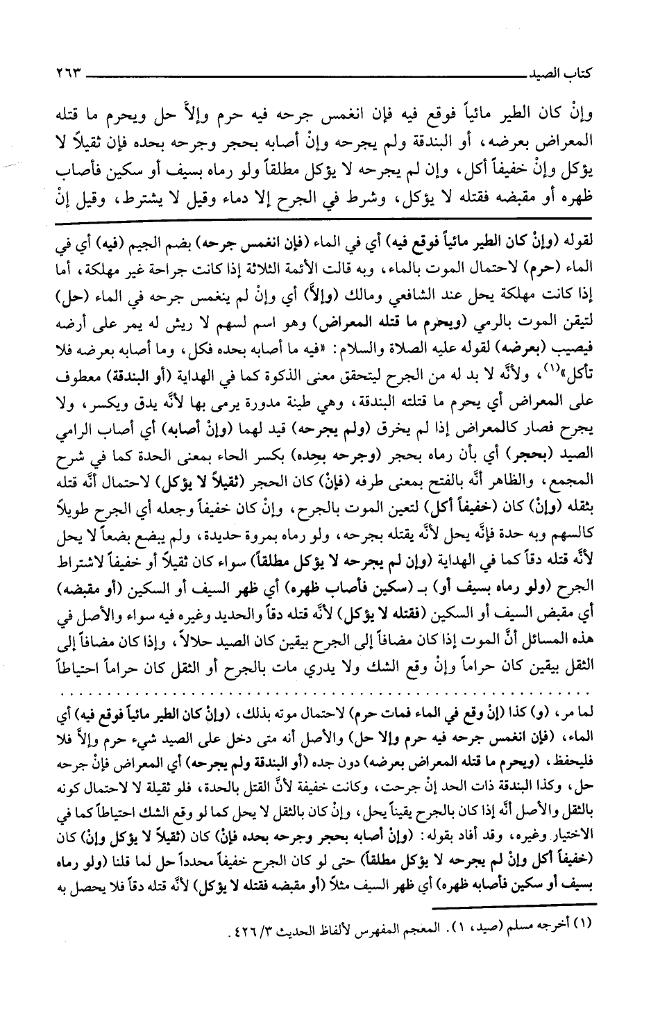 وإن كان الطير مائيا فوقع فيه أي في الماء فإن انغمس جرحه بضم الجيم فيه أي في الماء حرم لاحتمال الموت بالماء وبه قالت الأئمة الثلاثة إذا كانت جراحة غير مهلكة أما إذا كانت مهلكة يحل عند الشافعي ومالك وإلا أي وإن لم ينغمس جرحه في الماء حل لتيقن الموت بالرمي