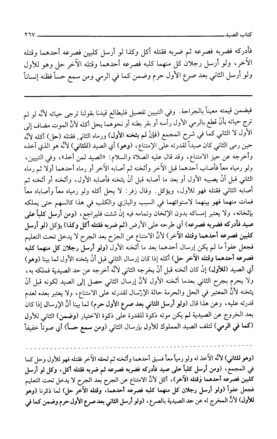 وفي التبيين ولو رمياه معا فأصاب أحدهما قبل الآخر وأثخنه ثم أصابه الآخر أو رماه أحدهما أولا ثم رماه الثاني قبل أن يصيبه الأول أو بعدما أصابه قبل أن يثخنه فأصابه الأول وأثخنه أو أثخنه ثم أصابه الثاني فقتله فهو للأول ويؤكل