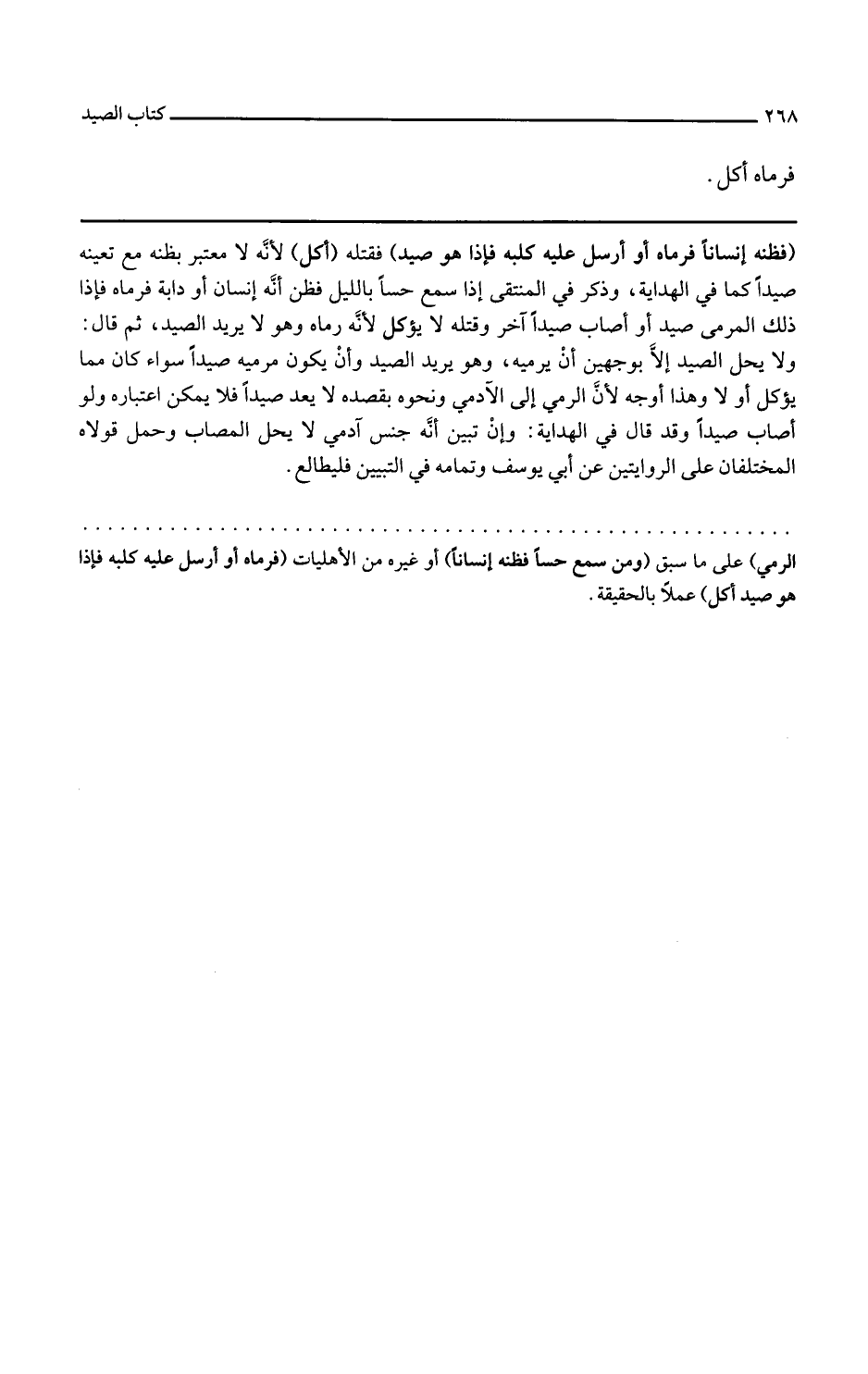 فظنه إنسانا فرماه أو أرسل عليه كلبه فإذا هو صيد فقتله أكل لأنه لا معتبر بظنه مع تعينه صيدا كما في الهداية وذكر في المنتقى إذا سمع حسا بالليل فظن أنه إنسان أو دابة فرماه فإذا ذلك المرمي صيد أو أصاب صيدا آخر وقتله لا يؤكل لأنه رماه وهو لا يريد الصيد ثم قال ولا يحل الصيد إلا بوجهين أن يرميه وهو يريد الصيد وأن يكون مرميه صيدا سواء كان مما يؤكل أو لا وهذا أوجه لأن الرمي إلى الآدمي ونحوه بقصده لا يعد صيدا فلا يمكن اعتباره ولو أصاب صيدا وقد قال في الهداية وإن تبين أنه حس آدمي لا يحل المصاب وحمل قولاه المختلفان على الروايتين عن أبي يوسف وتمامه في التبيين فليطالع