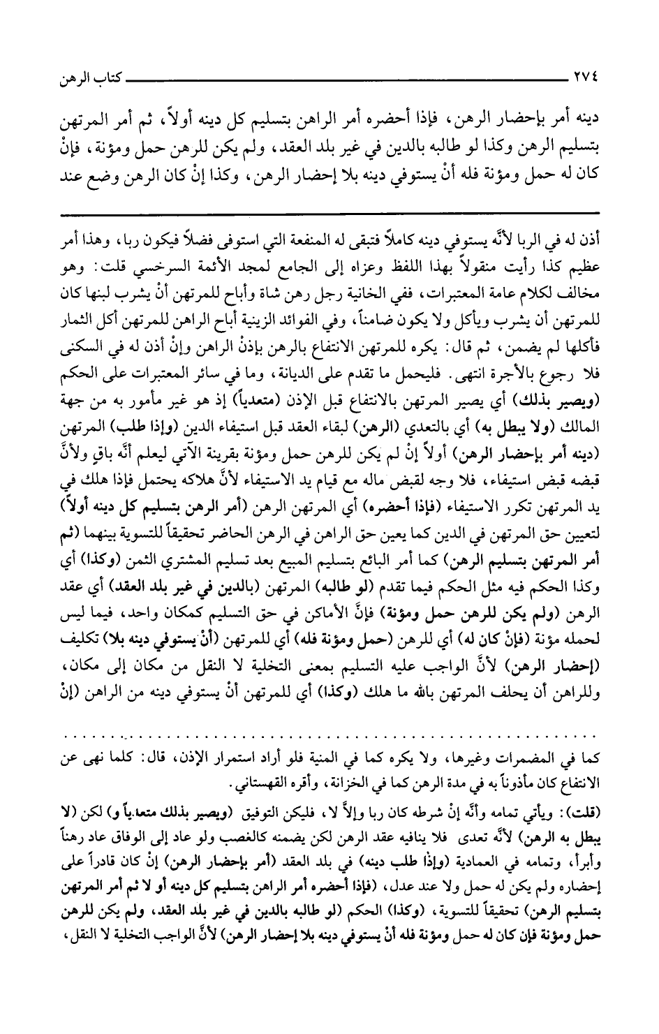 وإذا طلب المرتهن دينه أمر بإحضار الرهن أولا إن لم يكن للرهن حمل ومؤنة بقرينة الآتي ليعلم أنه باق ولأن قبضه قبض استيفاء فلا وجه لقبض ماله مع قيام يد الاستيفاء لأن هلاكه يحتمل فإذا هلك في يد المرتهن تكرر الاستيفاء فإذا أحضره أي المرتهن الرهن أمر الراهن بتسليم كل دينه أولا لتعيين حق المرتهن في الدين كما يعين حق الراهن في الرهن الحاضر تحقيقا للتسوية بينهما ثم أمر المرتهن بتسليم الرهن كما أمر البائع بتسليم المبيع بعد تسليم المشتري الثمن