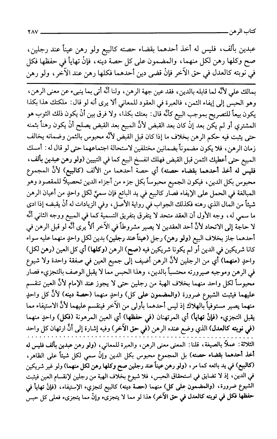 ولو رهن رجل عينا عند رجلين بدين لكل واحد منهما عليه سواء كانا شريكين في الدين أو لم يكونا شريكين فيه صح الرهن وكلها أي كل العين رهن لكل واحد منهما أي من الرجلين لأن الرهن أضيف إلى جميع العين صفقة واحدة ولا شيوع في الرهن وموجبه صيرورته محتسبا بالدين وهذا الحبس مما لا يقبل الوصف بالتجزي فصار محبوسا لكل واحد منهما بخلاف الهبة من رجلين حتى لا يجوز عند الإمام لأن العين تنقسم عليهما فيثبت الشيوع ضرورة والمضمون على كل واحد منهما حصة دينه لأن كل واحد منهما يصير مستوفيا بالهلاك إذ ليس أحدهما بأولى من الآخر