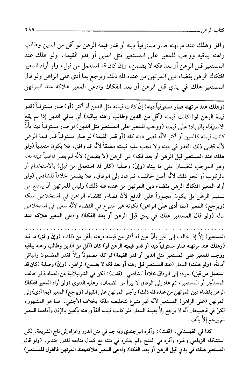 وهلك عند مرتهنه صار مستوفيا دينه إن كانت قيمته مثل الدين أو أكثر أو صار مستوفيا قدر قيمة الرهن لو كانت قيمته أقل من الدين وطالب راهنه بباقيه أي بباقي الدين إذا لم يقع الاستيفاء بالزيادة على قيمته
