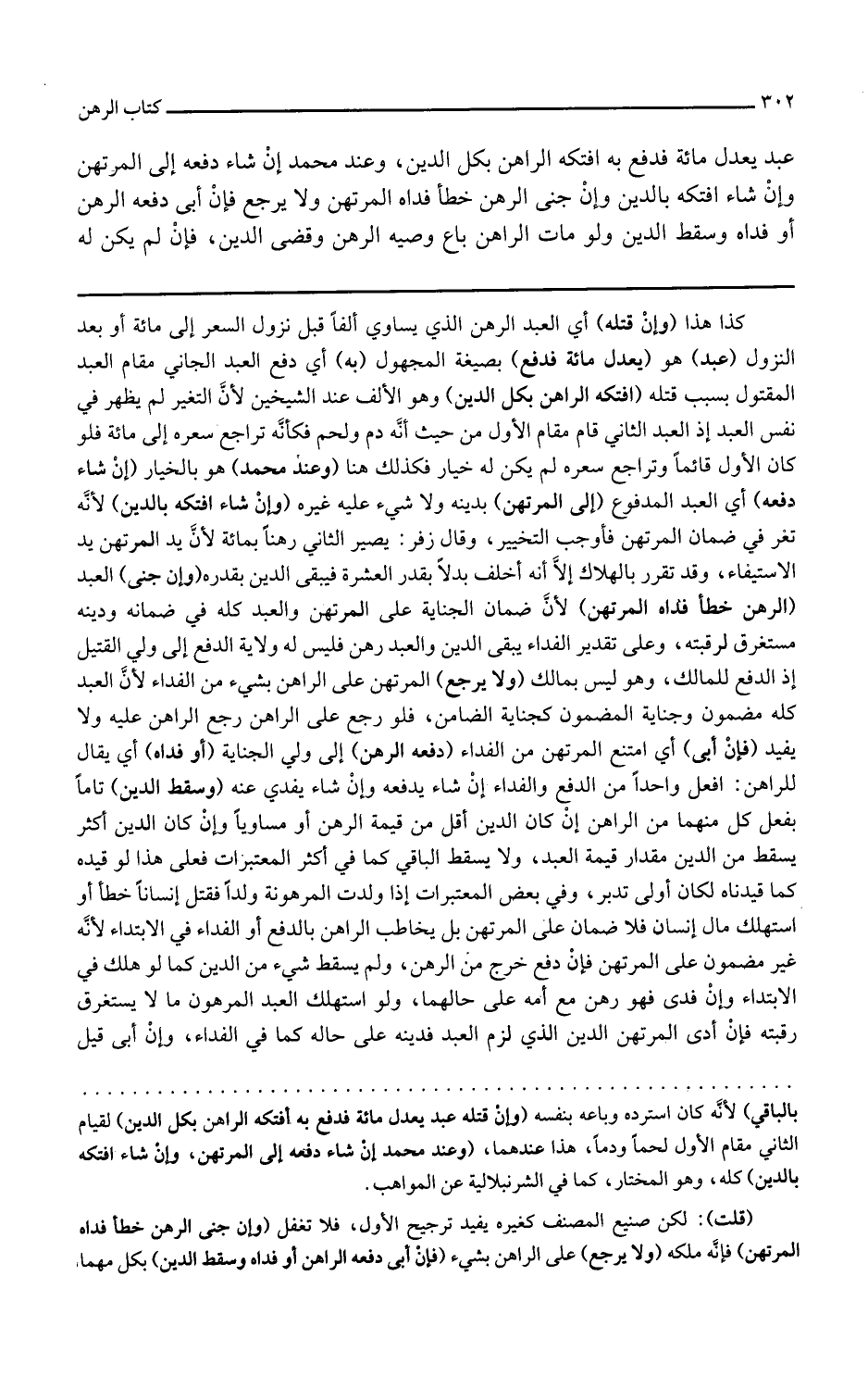 على الراهن بشيء من الفداء لأن العبد كله مضمون وجناية المضمون كجناية الضامن فلو رجع على الراهن رجع الراهن عليه ولا يفيد فإن أبى أي امتنع المرتهن من الفداء دفعه الرهن إلى ولي الجناية أو فداه أي يقال للراهن افعل واحدا من الدفع والفداء إن شاء يدفعه وإن شاء يفدي عنه وسقط الدين تاما بفعل كل منهما من الراهن إن كان الدين أقل من قيمة الرهن أو مساويا وإن كان الدين أكثر يسقط من الدين مقدار قيمة العبد ولا يسقط الباقي كما في أكثر المعتبرات فعلى هذا لو قيده كما قيدناه لكان أولى تدبر وفي بعض المعتبرات إذا ولدت المرهونة ولدا فقتل إنسانا خطأ أو استهلك مال إنسان فلا ضمان على المرتهن بل يخاطب الراهن بالدفع أو الفداء في الابتداء لأنه غير مضمون على المرتهن فإن دفع خرج من الرهن ولم يسقط شيء من الدين كما لو هلك في الابتداء وإن فدى فهو رهن مع أمه على حالهما ولو استهلك العبد المرهون مالا يستغرق رقبته فإن ادعى المرتهن الدين الذي لزم العبد فدينه على حاله كما في الفداء وإن أبى قيل