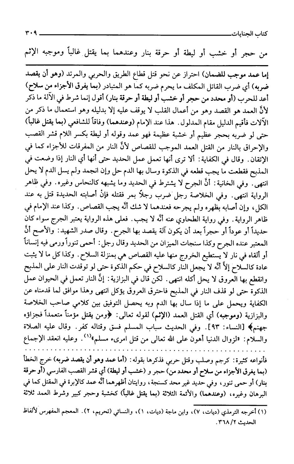 وقال رجل أحمى تنورا ورمى فيه إنسانا أو ألقاه في نار لا يستطيع الخروج منها عليه القصاص هي بمنزلة السلاح وكذا كل ما لا يثبت عادة كالسلاح إلا أنه لا يجعل النار كالسلاح في حكم الذكاة حتى لو توقدت النار على المذبح وانقطع بها العروق لا يحل أكله انتهى لكن قال في البزازية إن النار تعمل في الحيوان عمل الذكاة حتى لو قذف النار في المذبح فاحترق العروق يؤكل انتهى وهذا موافق لما قدمناه عن الكفاية ويحمل على ما إذا سال بها الدم وبه يحصل التوفيق بين كلامي صاحب الخلاصة والبزازية وموجبه أي القتل العمد الإثم لقوله تعالى ومن يقتل مؤمنا متعمدا فجزاؤه جهنم وفي الحديث سباب المسلم فسق وقتاله كفر